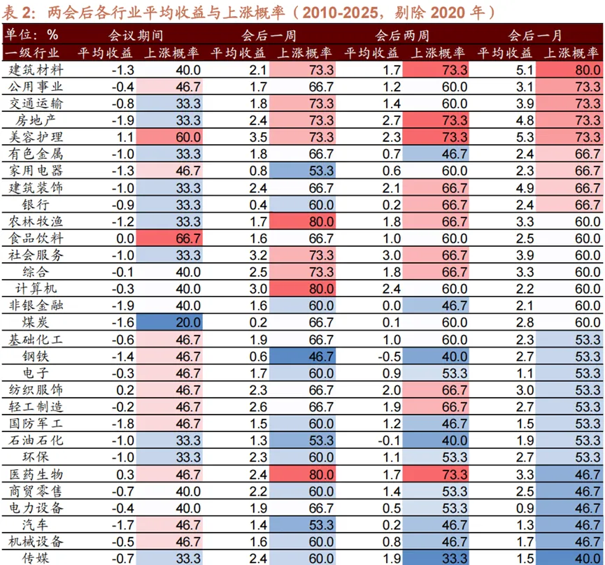 两会期间通信板块的上涨概率高于50%,会后的一周和两周,上涨概率较高的板块会切换到顺周期行业,底层逻辑是,两会期间会确定全年的GDP,也会有更多促增长政策上台,对于顺周期板块是利好。