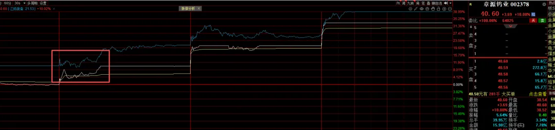 结果节后ai影视并没有发酵,反而是光纤反包,这个时候也知道长飞光纤处于被动上涨阶段,也没有加仓,进而继续关注其他方向,此时章源钨业显示出了非常强劲的做多态度: