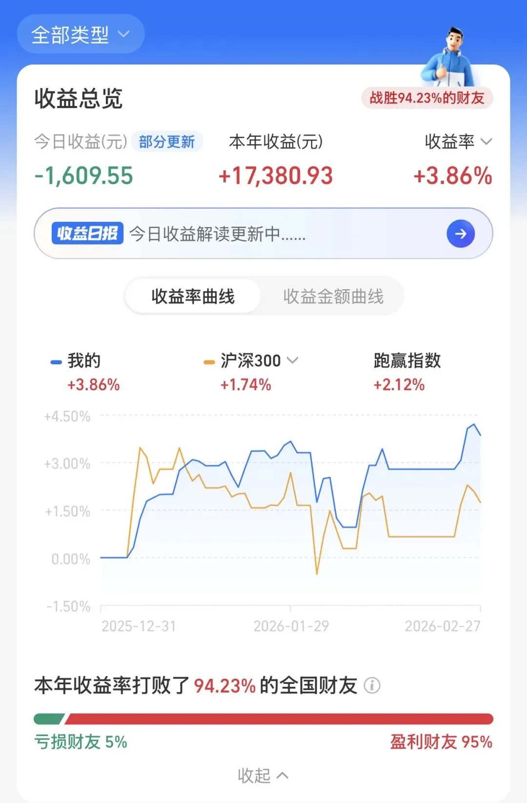 今日亏损1609.55,都是美股纳指的亏损,亏了1700+,不算纳指的话其他整体还是盈利。