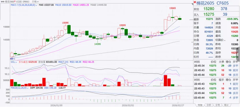 2月27日晚盘,预计受日内超买和多头减仓影响,预计在15300-15450 区间窄幅震荡,若跌破15300则可能下探15200支撑。3月2日,若晚盘回调充分,叠加下游旺季预期,有望重回15400-15500 区间;若美棉走弱,则需警惕进一步回调至 15100。下探15200。