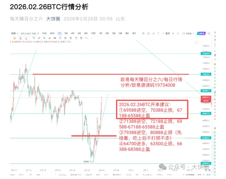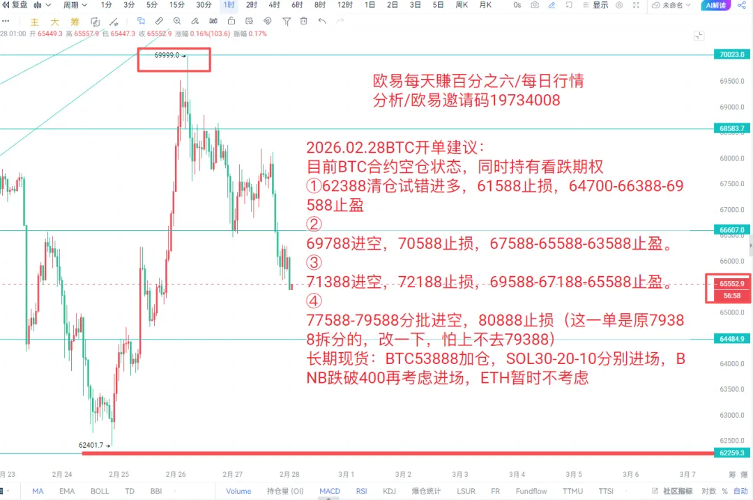 现在是2026.02.28凌晨01:03分,26日凌晨给出BTC69588空单(图二)在65588按照策略止盈,策略频道均价2105ETH中长线空单(图三)按照策略等待1888减仓后格局至最终目标,目前ETH价格在1920下方,很快就到,今日下跌前低价买入了下月份看跌期权(图四),作为对下方多单的对冲。图片太多,赚多少自己算。