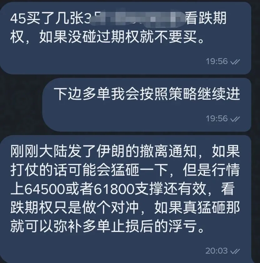 今日的下跌符合前几日给出的震荡预期,消息方面由于受中东地缘局势的影响,多国发布了人员撤离通知,战争好似一触即发,对于这种突发行情不是我们普通交易者可以提前预知的,对市场行情的改变也无法确定,所以已经做了一个看跌期权来防止踏空爆发行情,对比追空性价比也更合适。技术方面,645及618的支撑目前依旧有效,迫于未知的消息取消了64700多单挂单入场,会根据市价行情的情况再确定是否入场,左侧62388多单继续挂着,也是对看跌期权的一种对冲,只要跌破,期权赚的更多。这也是前段时间说过的正在研究的一种性价比超高的对冲交易方式。合约方面,BTC上方空单已经按照策略离场,即使今日跌破下方支撑有打出新低的可能我也不会选择追空,在K线没有走出当前价格箱体的情况下,合约依旧按照原有既定策略进行,鉴于不确定的消息面影响,需要轻仓保守一些。