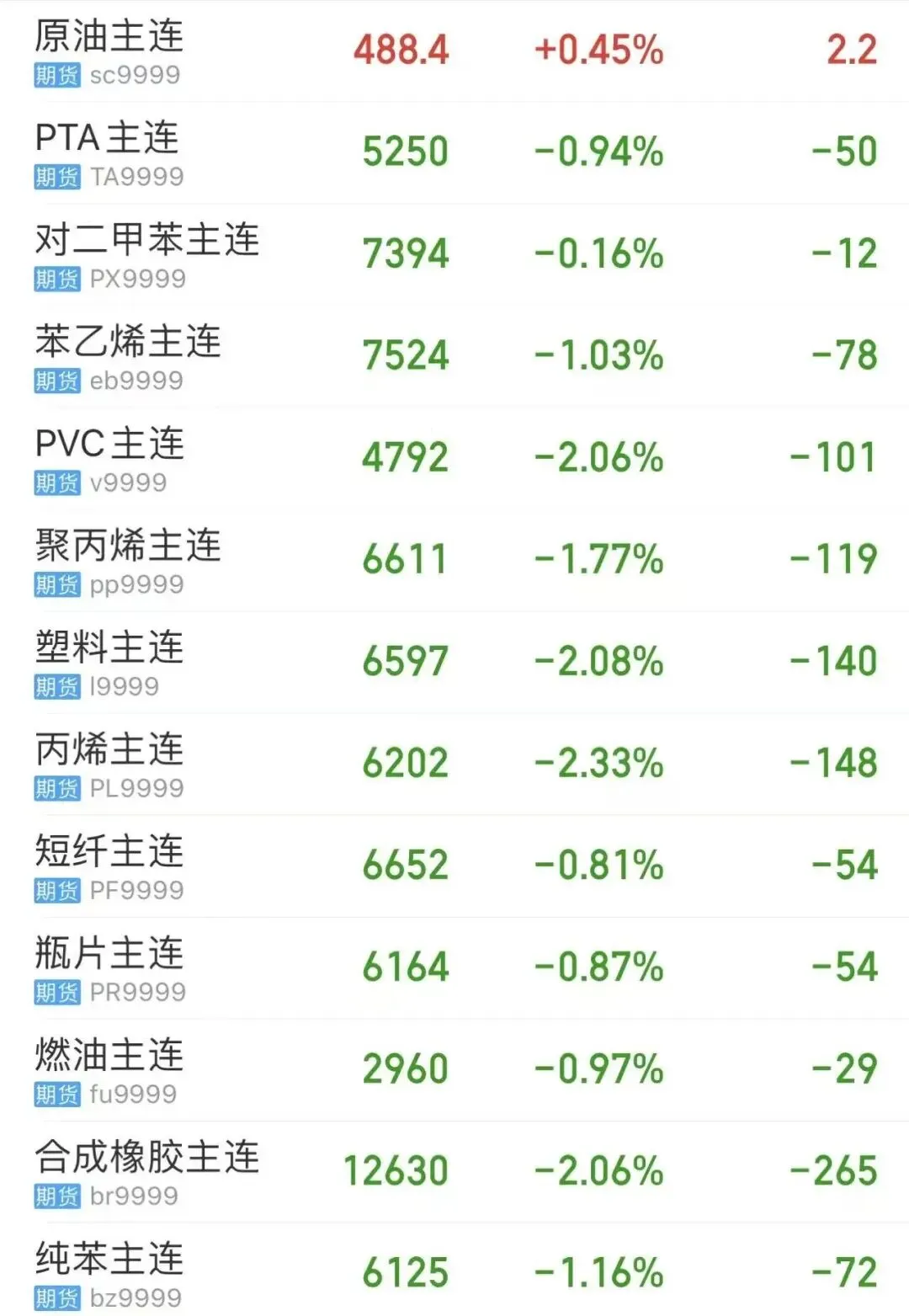 除原油外,国内化工品期货市场延续跌势,丙烯跌2.33%,塑料跌2.08%,PVC跌2.06%,PP跌1.77%,纯苯跌1.16%,苯乙烯跌1.03%,PTA跌0.94%,瓶片跌0.87%,短纤、乙二醇、对二甲苯均有不同程度跌幅。