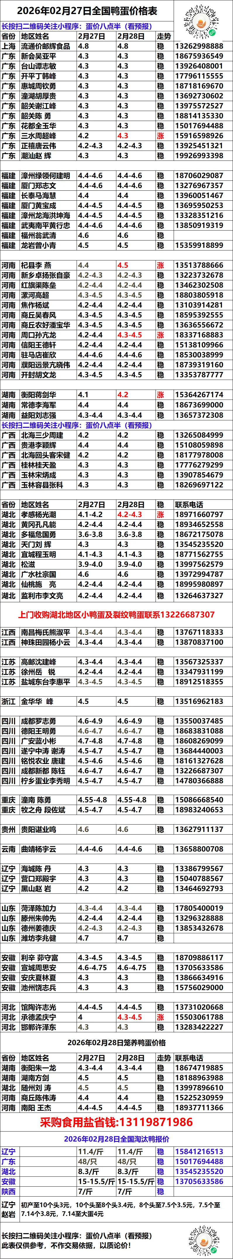 亲爱的读者朋友: 您所看到的《全国鸭蛋价格天天报》数据,并非来自官方统计,而是由一线采购员、养殖合作社代表和鸭蛋生产厂家自发组成的行业联盟共同采集汇总。