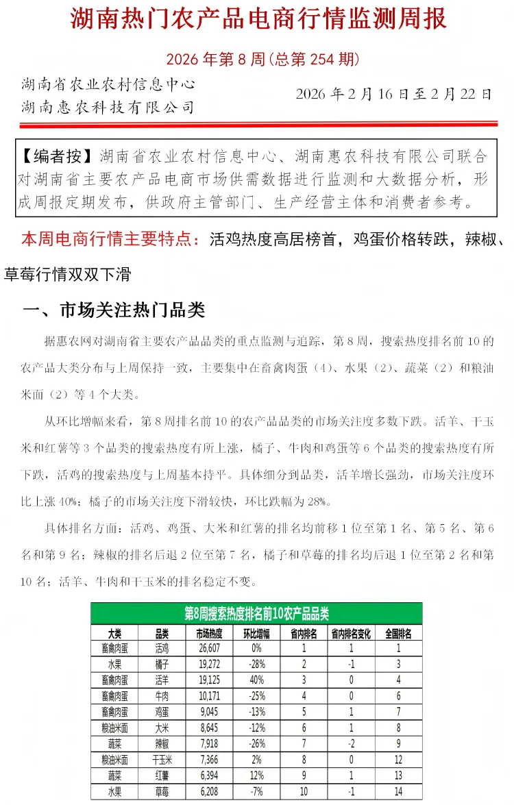 >湖南热门农产品电商行情监测周报(2026年第8期)