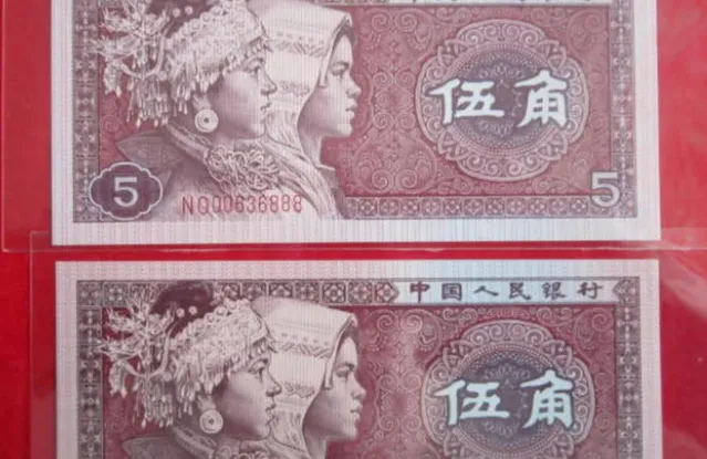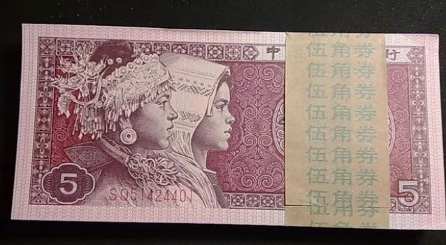 第四套人民币 的 五角纸币 采用 紫红色调 ,正面是苗族和壮族人物头像,背面是 国徽 图案。