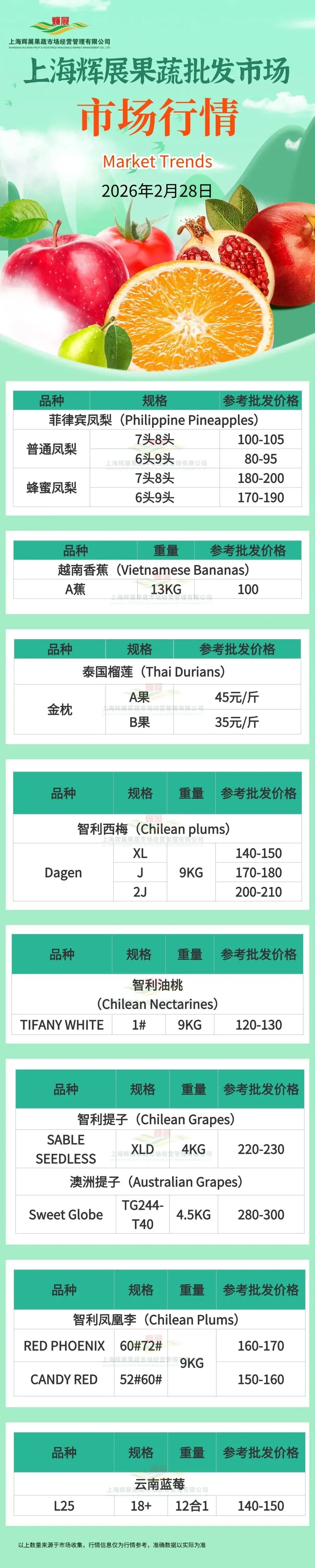 2月28日上海辉展果蔬批发市场行情 | 智利西梅、智利李、澳洲提子、智利桃、泰国榴莲等