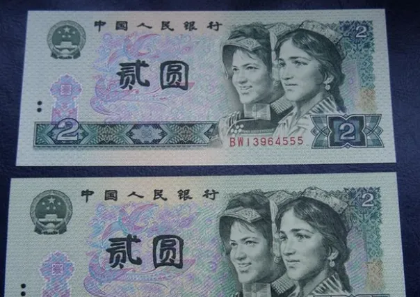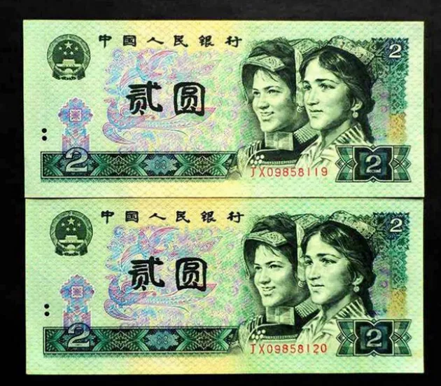 第四套人民币 中的 两元纸币,正面印着维吾尔族和彝族少女的头像,背面是南海南天一柱的景观。