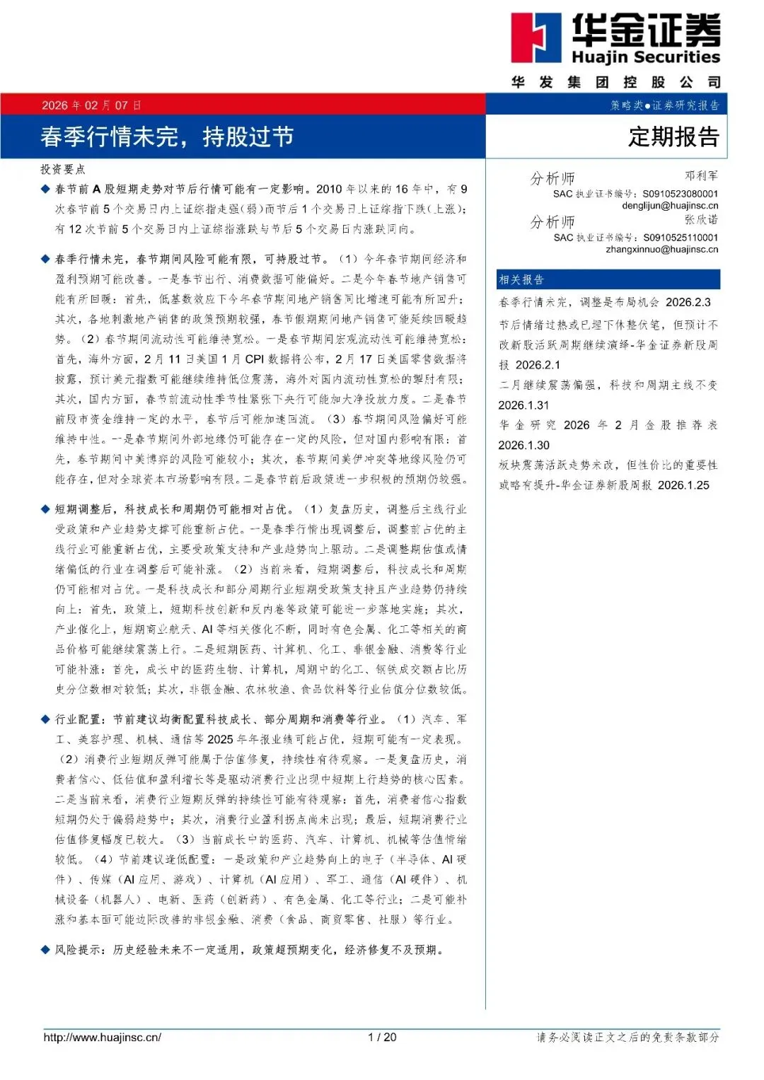 回复暗号:定期报告:春季行情未完,持股过节-260207-华金证券-20页