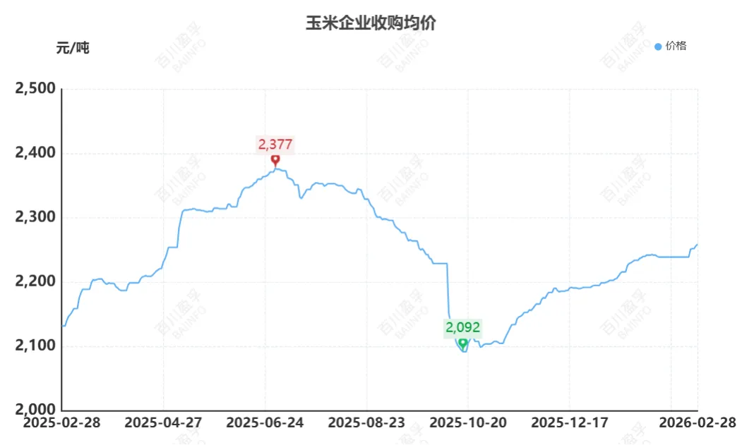 截止到2月28日,国内企业玉米收购均价为2259元/吨,较上一工作日上调3元/吨,涨幅0.13%,较上周上涨0.89%,较上月上涨0.85%,较年初上涨2.92%。节后基层售粮节奏滞后于企业复工进度,卖方惜售情绪较浓,加上局地阴雨天气扰动,粮源运输受限,市场中玉米流通量维持低位。用粮企业原料库存有所消耗,补库积极性升温,多提价刺激上量。整体玉米市场年后供应上量偏慢,需求难以满足,行情维持涨势。