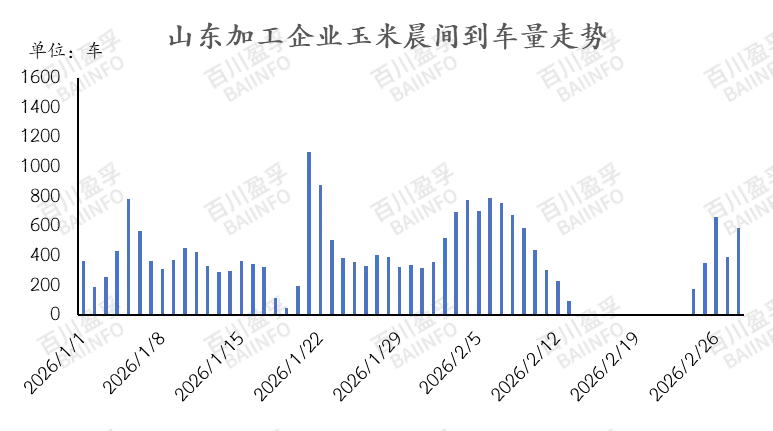 2026.2.24-2026.2.28期间,山东地区深加工企业晨间共到2162车,日均到432车,整体供应低位。春节后市场购销恢复缓慢,基层种植户出货相对观望,售粮活动尚不集中,短期内市场有效供给不足。叠加年后盘面连续上涨引导市场预期转向乐观,贸易商存储意愿提升,分散入市粮源,供应至企业粮源减少,市场供应维持紧张局面。