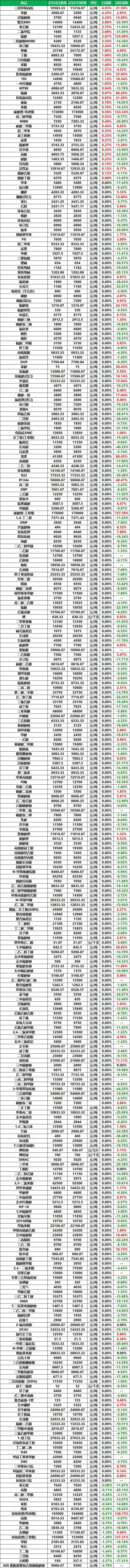 2026年2月27日大宗商品价格涨跌榜中化工板块环比上升的商品共37种,其中涨幅5%以上的商品共1种,占该板块被监测商品数的0.3%;涨幅前3的商品分别为三羟甲基丙烷(6.93%)、草酸(4.35%)、过硫酸钠(4.32%)。