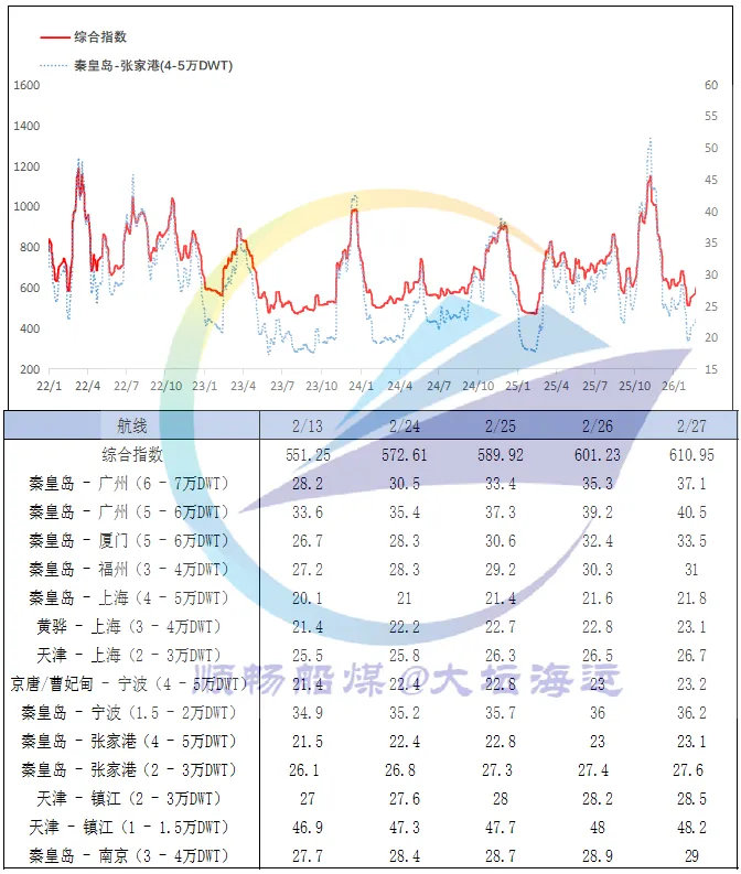 分析认为,主要受以下几方面因素支撑:一是下游工业企业逐渐复工复产节,节后刚需补库需求逐步释放;二是进口煤货源供应持续偏紧,且相较内贸煤价格倒挂幅度进一步扩大,促使部分终端将采购需求向内贸市场转移,带动运输需求增多;三是北方港口货源结构性短缺问题仍存,船舶等货时间有所延长,叠加港口气象封航扰动,运力周转效率下降,市场供需格局有所改善,为运价上涨提供了支撑。