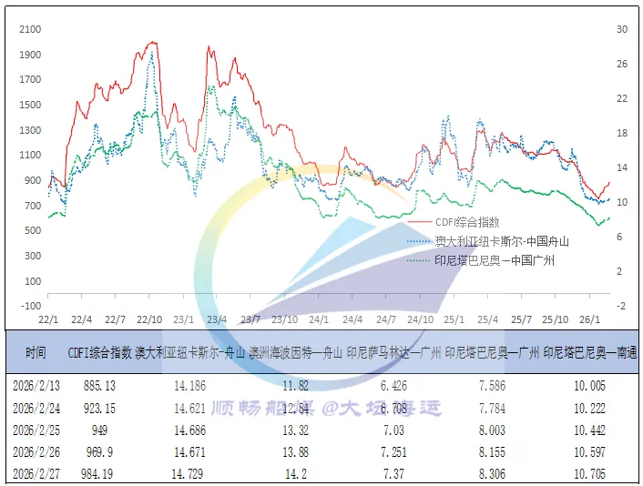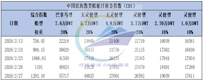 截至2月27日,中国沿海煤炭运价综合指数报收610.95点,较上周环比上涨10.83%,各航线运价涨幅在1.2元/吨至8.9元/吨之间。