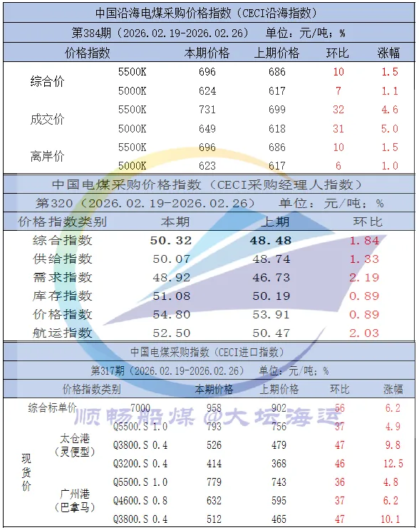 本期,CECI沿海电煤采购综合价格5500K较上期上涨1.5%,综合价格5000K较上期上涨1.1%;电煤采购经理人指数50.32元/吨,环比上涨1.84个百分点,电煤市场整体处于扩张区间。