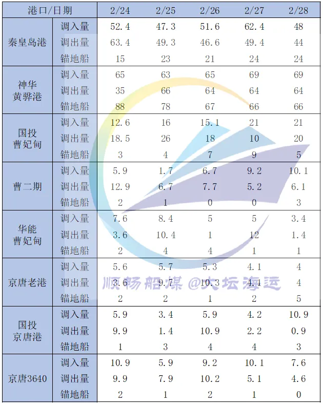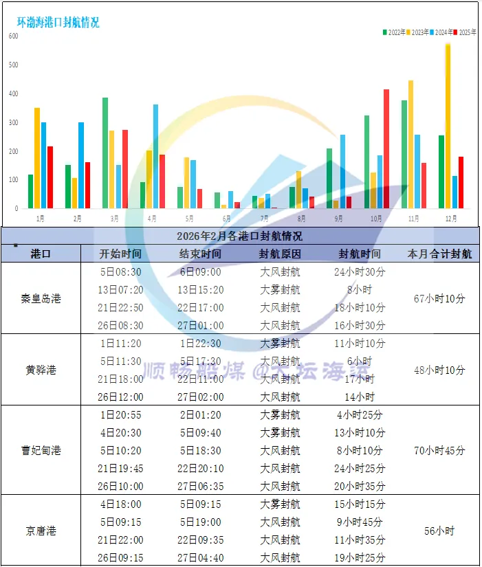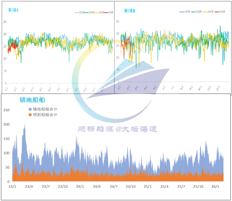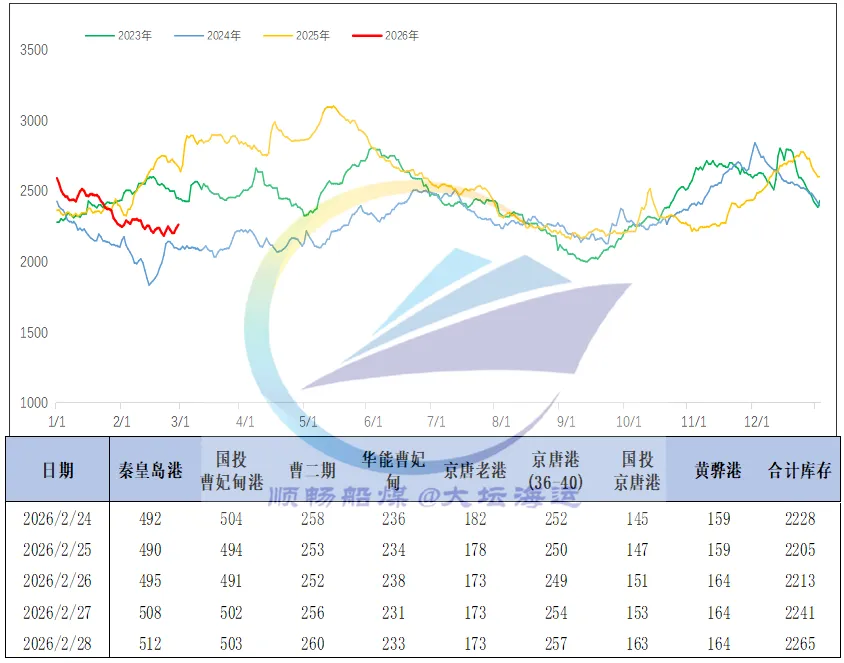 春节假期过后,产地煤矿陆续复产中,煤炭供应逐步恢复,叠加发运倒挂情况略有改善,贸易商发运积极性小幅提升,港口调入量明显增加;而下游补库需求虽同步释放,但因大风天气频发、多港长时间封航影响,船舶装卸效率显著下降,港口调出量受到明显制约,整体与调入量基本持平。受此影响,港口库存呈平稳震荡态势,与节前大体相当,但同比减少400余万吨,处于近年来相对低位。