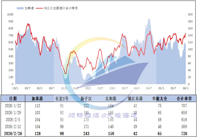 截至2月26日,长江口六大主要港口合计库存726万吨,环比上期增加138万吨。节后进口煤供应仍然紧俏,且较内贸煤价倒挂程度进一步加剧,下游将部分采购需求转移至内贸市场,北上派船意愿提升,叠加个别港口资源紧张、气象封航导致船舶运力周转效率下降,本周港口日均锚地船舶数量达111艘,整体处于偏好水平。