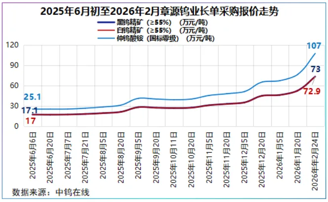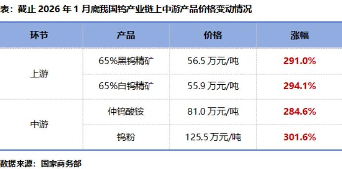 上游、中游产品亦是如此,截至2月24日,公司仲钨酸铵、≥55%黑钨精矿、≥55%白钨精矿较2025年6月初涨幅均已超320%。