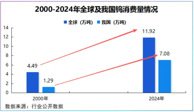 前面我们提到过,2000-2024年,全球钨消费量从4.49万吨增至11.92万吨,增幅高达1.65倍,我国消费量则从1.29万吨增至7.08万吨,增幅更是达4.49倍,显示出需求的紧迫。