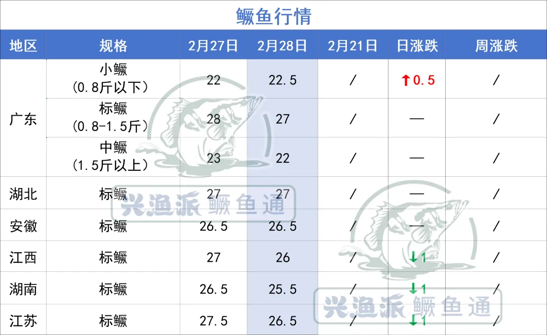 2月28日,广东小鳜涨0.5元/斤,江西湖南江苏标鳜价格跌1元/斤