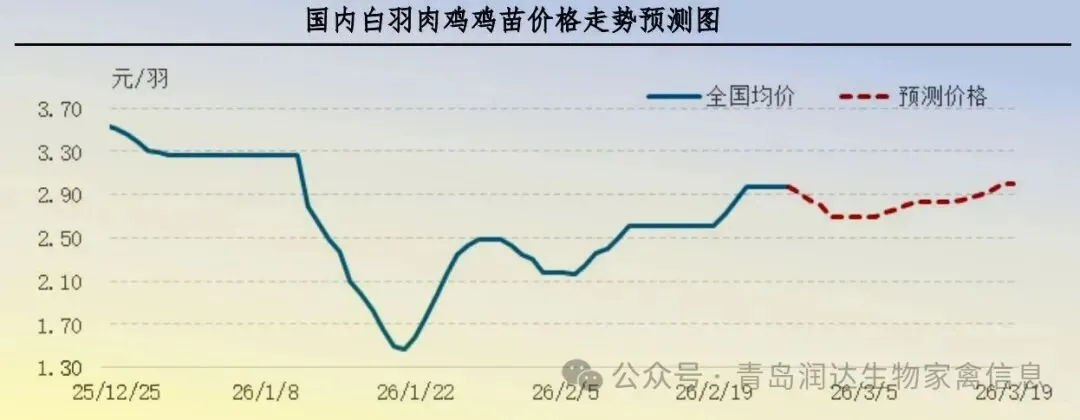 周内国内白羽肉鸡苗价格呈先涨后稳走势,周均价较节前一周上行。周内孵化场出苗量较节前一周增加。上半周毛鸡市场暂无成交,对鸡苗市场无影响,养殖端整体补栏积极性尚可,孵化场计划顺畅,主动上调报价,推动鸡苗成交价格上涨;下半周合同鸡屠宰企业开工,社会鸡成交量较少,对鸡苗市场影响较小,苗市交投尚可,但孵化场担忧后期毛鸡价格下跌,若鸡苗价格继续上涨,养殖户或强制议价,鸡苗价格或跌幅较大,因此孵化场停止上调报价,鸡苗成交价格趋稳运行。