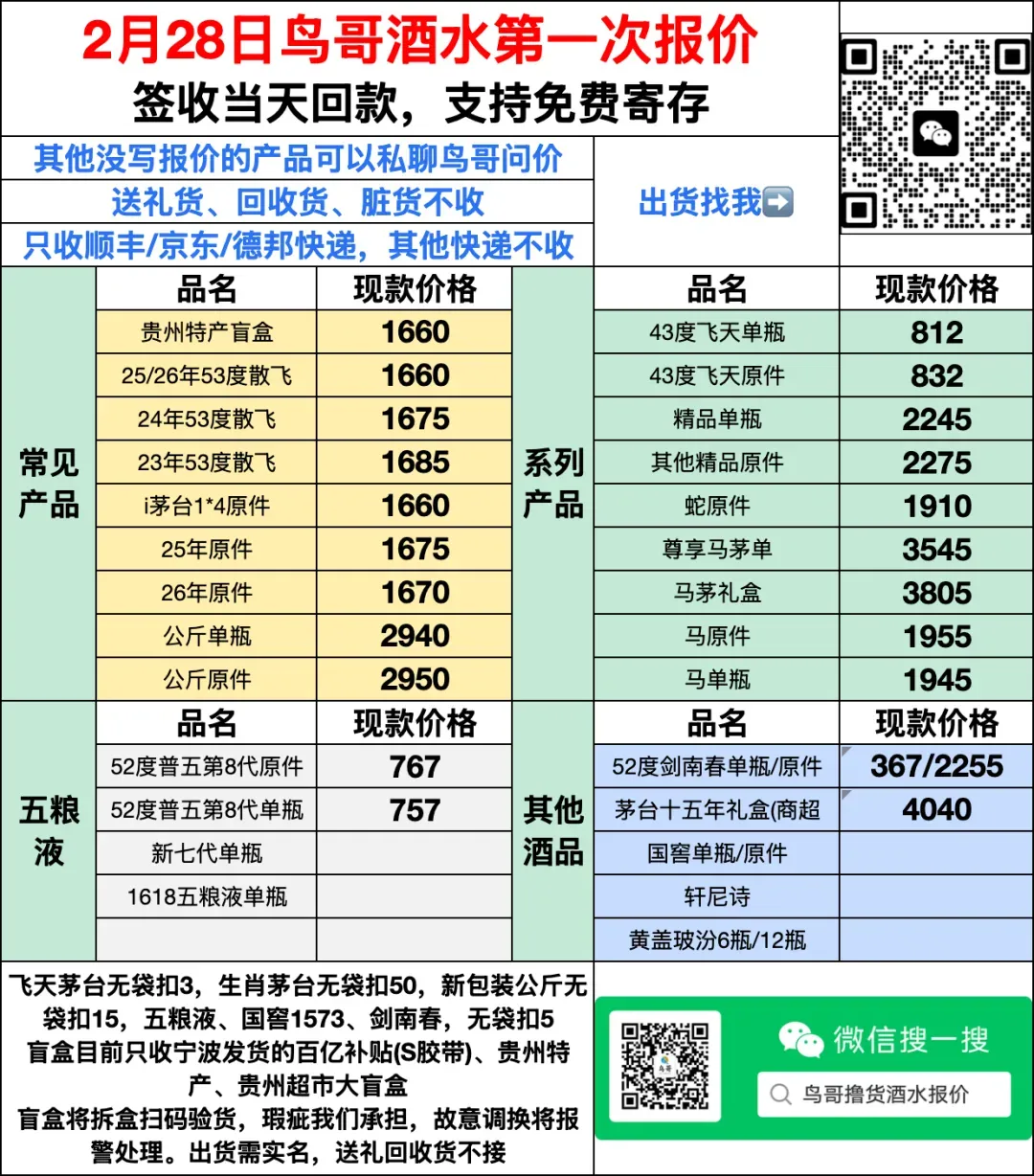 | 寄件地址:鸟哥收货小程序复制地址:回款收款:宁波地址签收后私信鸟哥报单:单号+明细到货默认出货,要寄存请提前通知!例如: SF6688548664364+ 飞天茅台盲盒双瓶*8+八代五粮液*6+出库/寄存 签收验货现款秒款 |