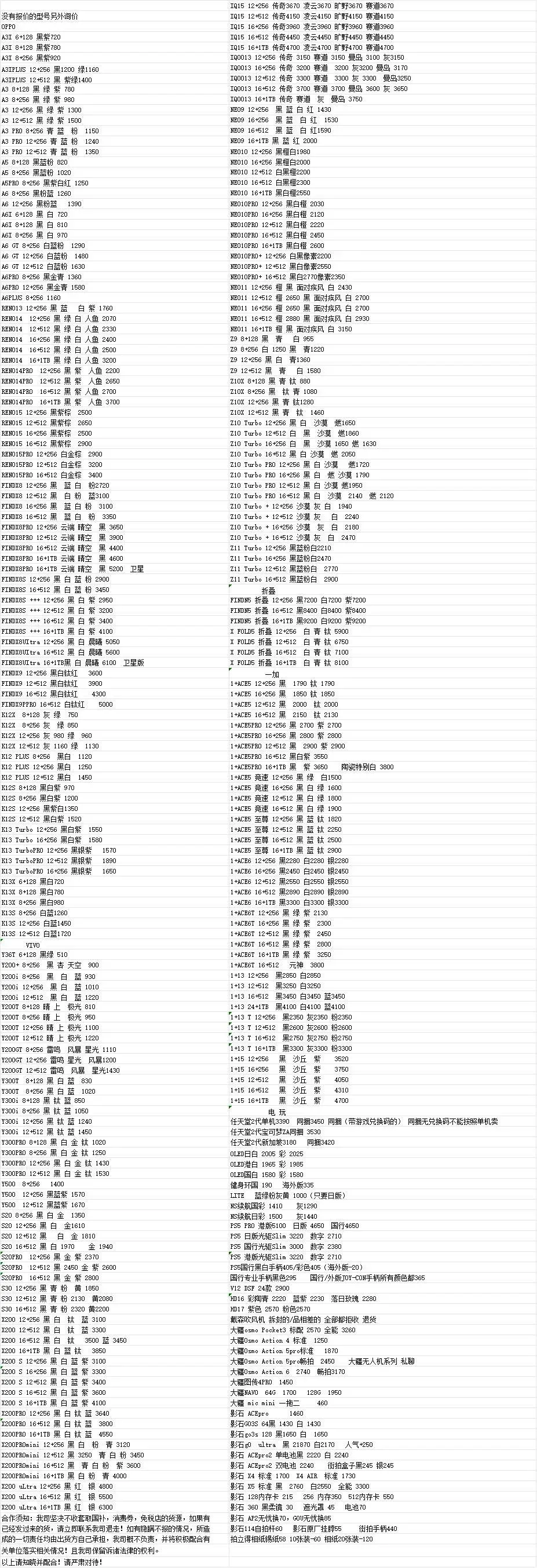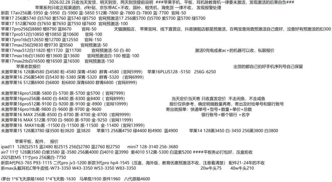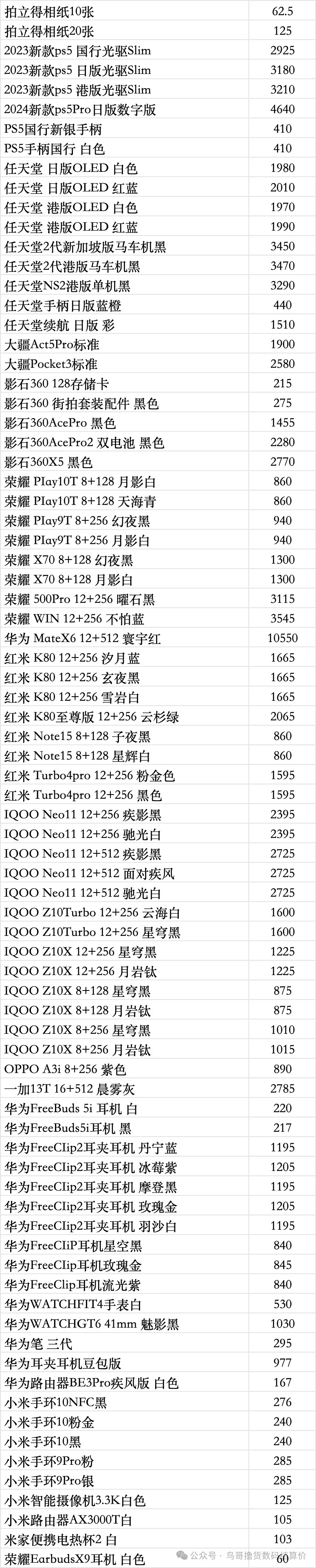 任天堂游戏机: 新款二代NS2港版标配机:3290 新款二代NS2港版马车机:3470,没游戏码:3240(注意下单要看有没有游戏码的 要不然就是便宜的) 新款二代NS2韩版马车机 没游戏码的:3170 新款二代NS2新加坡版 台版 单机:3210,就是没有游戏的 新款二代NS2韩版 欧版 美版 单机:3190,就是没有游戏的 新款二代NS2新加坡版同捆:3480 NS2港版宝可梦同捆:3570 OLED屏 日版白-2005 彩色-2020 OLED屏 港版白-1950 彩色-2000 OLED屏 国行白-1670 彩色-1670 OLED屏 朱紫港版-1990 日版-1990 OLED屏 喷射港版-1990 日版-1990 健身环国行-145 海外版-350 LITE日版 港版 蓝:1035,黑粉1035,绿黄1035 注意区分,这些就不是oled屏的 价格以下(续航版) NS续航国彩-1430 黑-1310,拆封-50 NS港彩续航- 长款- NS续航日彩-1510 黑-1440 长款-30 索尼PS5游戏机 (PS5都要留好纸箱带来,以免破坏品相) 2024新款:PS5 PRO日数:4690 2024新款:PS5 PRO港数:5120 2025新款:PS5 PRO国数:4690 2023新款ps5 日版光驱Slim:3210 2023新款ps5 日版数字Slim:2710 2023新款ps5 国行光驱Slim:老款:2990,新款3010 2023新款ps5 国行数字Slim:2350 2023新款ps5 港版光驱Slim:3240 2023新款ps5 港版数字Slim:2710 PS5国行手柄:黑白410,其他410,外版-20 只收跨境 PSP串流机:1345白,1345黑 PS5单光驱:615,外版575 ROG XBOX : OLED SteamDeck掌机掌上游戏机 512G 美:4010,日港:4010 OLED SteamDeck掌机掌上游戏机 1TB 美:4630,日港:4630 大疆3标准:,全能: 大疆Action4标准:,全能: 大疆ACT5 Pro标准:,全能: 大疆action5pro畅拍: 大疆AC6标准: 大疆AC6畅拍: 大疆NEO标配:,全能: 大疆OM7P:,om7: 大疆 mic1拖1:,1拖2: o4图传: 拍立得MINI12影像花室套装:,外版,一次成像礼盒装 拍立得SE国行:,白色: 拍立得相纸20张:125,10张:62.5 拍立得锡纸装10张:59 任天堂 手柄 NS左右手柄:385 NS2左右手柄:430 NS2 PRO 黑柄:420 PRO国黑柄:305,外版280只收跨境 PRO乱斗柄:320只收跨境 PRO王泪柄:340只收跨境 PRO喷射柄:340只收跨境 PRO异度柄:340只收跨境 2026年2月28日 华为配件全系列 行情参考 以结算价为准 所有货都不收国补的,一经发现就当送我们的 华为手表系列 华为 Watch FiT4 黑535白535绿555紫535银575 华为 Watch FIT4 pro 黑1150蓝1105绿1185 华为WATCH FIT 2活力款 黑色325粉325 华为WATCH FIT 3 黑435灰545月光白435原野绿455粉435薄荷绿445蓝435珍珠白495 Watch D2 黑 2815白2715蓝2715 Watch D2 药房版 2445 Watch buds 黑1135卡其色 1215 GT4 41m 白 795黑725草木绿00 GT4 46m 黑845棕00绿 00 Watch 4 黑 00褐 00白 00 Watch 4pro 棕 00火星钢00蓝00太空探索 00 Watch 5 46m 黑1795紫2175棕 2265蓝1855钛空银 2655 Watch 5 42m 黑1675白1865杏2255绿1725金2365 非凡2 黑5045蓝6015 非凡手表 黑3445蓝 00绿00 华为新款WATCH GT5系列 GT5 46黑1105蓝935棕915灰915 GT5 41 黑 945蓝895白925青865棕840 GT5pro 黑1195陶瓷2135钛钢色 1405冰川白1025 GT6 pro 黑1775棕2095钢2485 GT6 46m黑 1115灰色 1280绿色 1435 GT6 41m 黑 1030棕色 1415白色 1230紫色1030蓝1035 华为儿童手表系列 儿童4pro蓝500粉505 儿童5pro 蓝765粉755绿760紫760 儿童5X 蓝740粉740 儿童5Xpro 黑1100紫1110 儿童5 绿350紫350蓝415活力蓝345红345 儿童5星耀 粉410蓝425 荣耀手环,华为手环 荣耀手环9标准黑95蓝103紫103 荣耀手环9NFC 黑115蓝115紫115 荣耀手环10标准黑130绿135灰135蓝135 荣耀手环10NFC 黑155灰155绿155蓝150 华为手环系列 华为手环8标准黑103粉105 华为手环8NFC 黑105 华为手环9 黑155白145粉143黄 140蓝145 华为手环9nfc版 黑162白152粉150蓝150黄150 华为手环10标准 黑158粉158 华为手环10铝合金款 黑168白168蓝168紫170向新绿160原野绿155灰160 华为手环10NFC 黑187白193蓝193紫198绿190 B7 黑700灰700 华为耳机系列 华为Free Arc 绿400灰410黑410白385 华为 FreeBuds 7i 白330灰325粉330 华为freebuds6i耳机 白265黑270紫280 华为耳机Free clip2 黑1205白1195蓝1195金1205紫1205 华为耳机Free clip 黑色835暖星云925紫 835玫瑰金840 华为耳机FreeBuds 5i 黑213白218蓝217 华为FreeBuds se2 耳机 白72蓝73黑73紫74 华为 FreeBuds se3 黑102金102白100 华为 FreeBuds Se4 白151黑151 FreeBuds 6 白530黑530紫525金525 FreeBuds 4e 2024款 白285银285 FreeBuds pro5 白1070银1075金1075 FreeBuds pro4 黑715绿695白730 华为CD56 pro笔 465 华为CD57 黑280白295 华为CD54S 三代笔292 华为 三代笔充电器 78 Wifi5 黑175白175青173 WiFi3 pro 265 AX3 116 AX6 new 235 AX3 pro new 197 AX3 pro WiFi7 187 BE3pro 千兆版 180 BE3pro 疾风版 165 BE7pro 395 AX2pro 102 Q6 一拖一凌宵版 465 荣耀手表 荣耀手表4pro 黑725棕825绿795 荣耀手表5pro 蓝牙版黑1075灰1075 荣耀手表5pro 插卡版黑1175灰1175 荣耀手表5Ultra黑1195棕1445钛金属1895 荣耀手表5 黑525金525 移动电源 华为22.5w se 移动电源 黑85白90 华为66w 电源 白180蓝190 |
