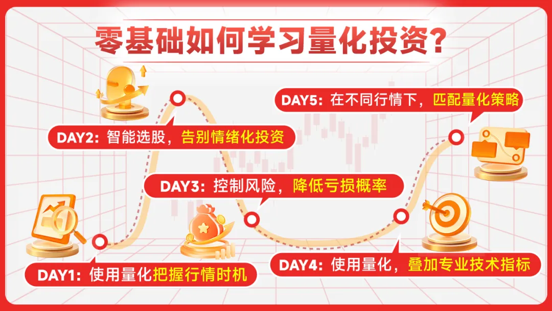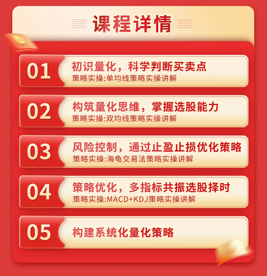 一共5天的学习,干货很足,涵盖选股、把握行情时机、风控的8大经典量化交易策略,把量化交易必学的方法、理论打包在一起,还提供免费量化工具给大家亲自上手实操。不用你额外花钱买量化交易工具,一条龙学习。