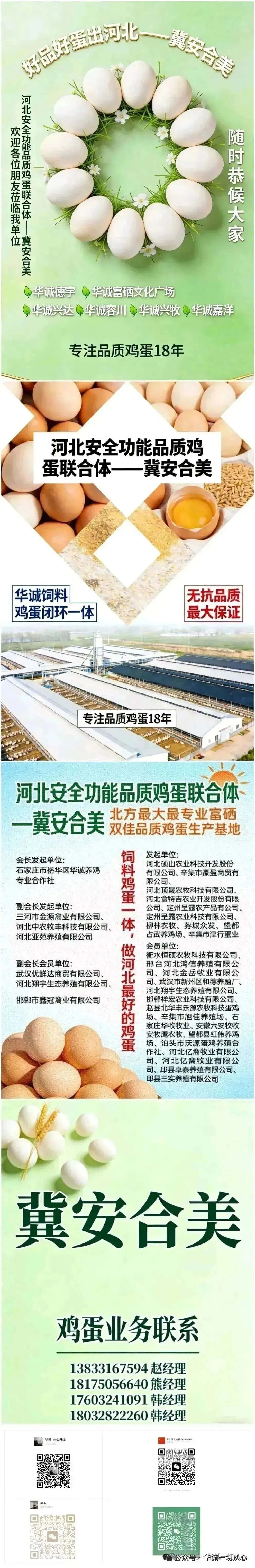 河北安全功能品质鸡蛋联合体以厚德为承载 以真诚为担当 以坚韧为脊梁 努力打造河北高品质鸡蛋第一品牌——冀安合美 联合体采取鸡蛋饲料一体 统一标准 统一品控 统一销售的模式 以保障联合体成员根本利益为基础 目标建立冀安合美品牌鸡蛋报价体系 提高冀安合美品牌价值 目前 联合体日产合格冀安合美品牌鸡蛋5000箱左右 随着市场对冀安合美品牌鸡蛋需求量的上升 联合体需在全国蛋鸡主产区继续寻求规模化鸡场合作 价格高于当地报价收购 希望有识之士加入 我们携手并进 共享共赢同创辉煌 冀安合美是河北安全功能品质鸡蛋联合体的简称 也是鸡蛋产品的注册商标 是河北品质鸡蛋一张靓丽名片 坚持饲料鸡蛋一体 坚持全产业品控 品种有海兰 罗曼 大午 农一 农三 冀安合美(华诚)18年沉淀 专业富硒双佳品质 饲料鸡蛋一体全产业品控 富硒双佳高品质 我们更专业