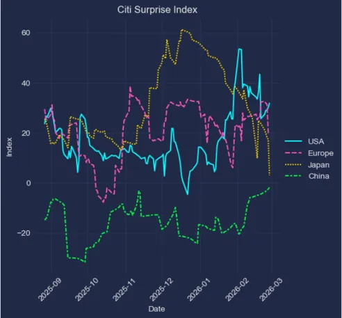 花旗经济意外指数:中美同步反弹,欧日走弱明显