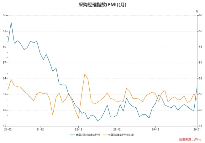 1月制造业PMI美强中弱,两国劈叉明显