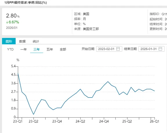 美国1月PPI同比不及预期和前值