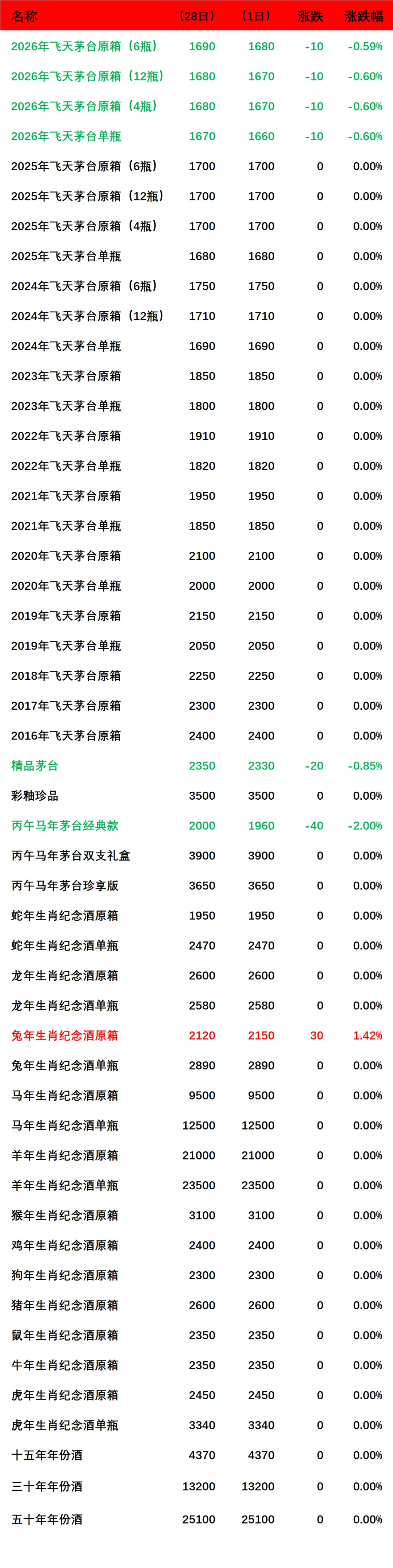 丙午马年经典版,精品茅台,2026年飞天茅台原箱(4瓶、6瓶和12瓶)和单瓶等多个产品下跌。