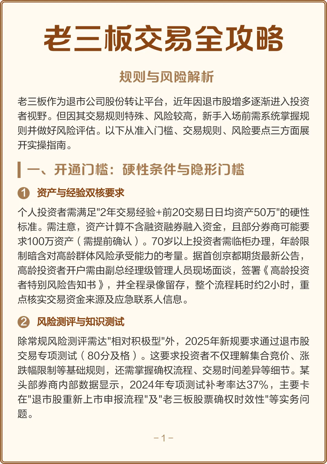 正式文件及实施细则可能随市场反应调整,需密切关注全国股转系统公告。30%涨跌幅下,单日波动加剧,需设置止盈止损,避免满仓。个人需满足2年交易经验+20日日均资产≥50万,机构3月1日起“只卖不买”。