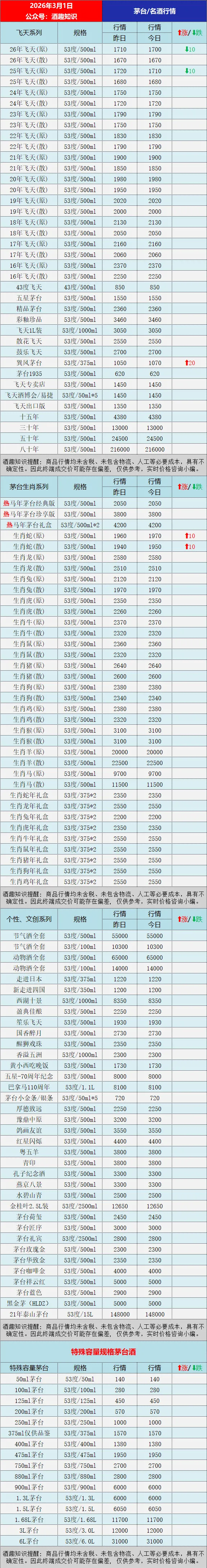 今日茅台酒行情价格参考:飞天系列,2025-2026年飞天原箱下跌,巽风茅台上涨;生肖系列,蛇茅原箱、散瓶同步上涨。更多茅台系列酒具体行情参考下文图表:《酒趣知识》温馨提醒:商品信息均未含税、未包含物流、人工等必要成本,具有不确定性。因此终端成交价可能存在偏差, 仅供参考,实时价格咨询小编。注意:茅台等品牌老酒价格小幅波动频繁,老酒受品相克重影响价格差异大,同时不同地区价格有几十元不等的差价,最终以实际成交价格为准!《酒趣知识》公众号给您带来茅台酒及时行情参考,同步深挖茅台、五粮液、汾酒等各大名酒资讯,为酒友奉上客观的价格参考与专业的行业解读,让大家用酒有价可依、避坑无忧。丨声明:部分图文来源于网络,版权归原作者所有,如涉及版权等问题,请及时与小编联系删除或修改。