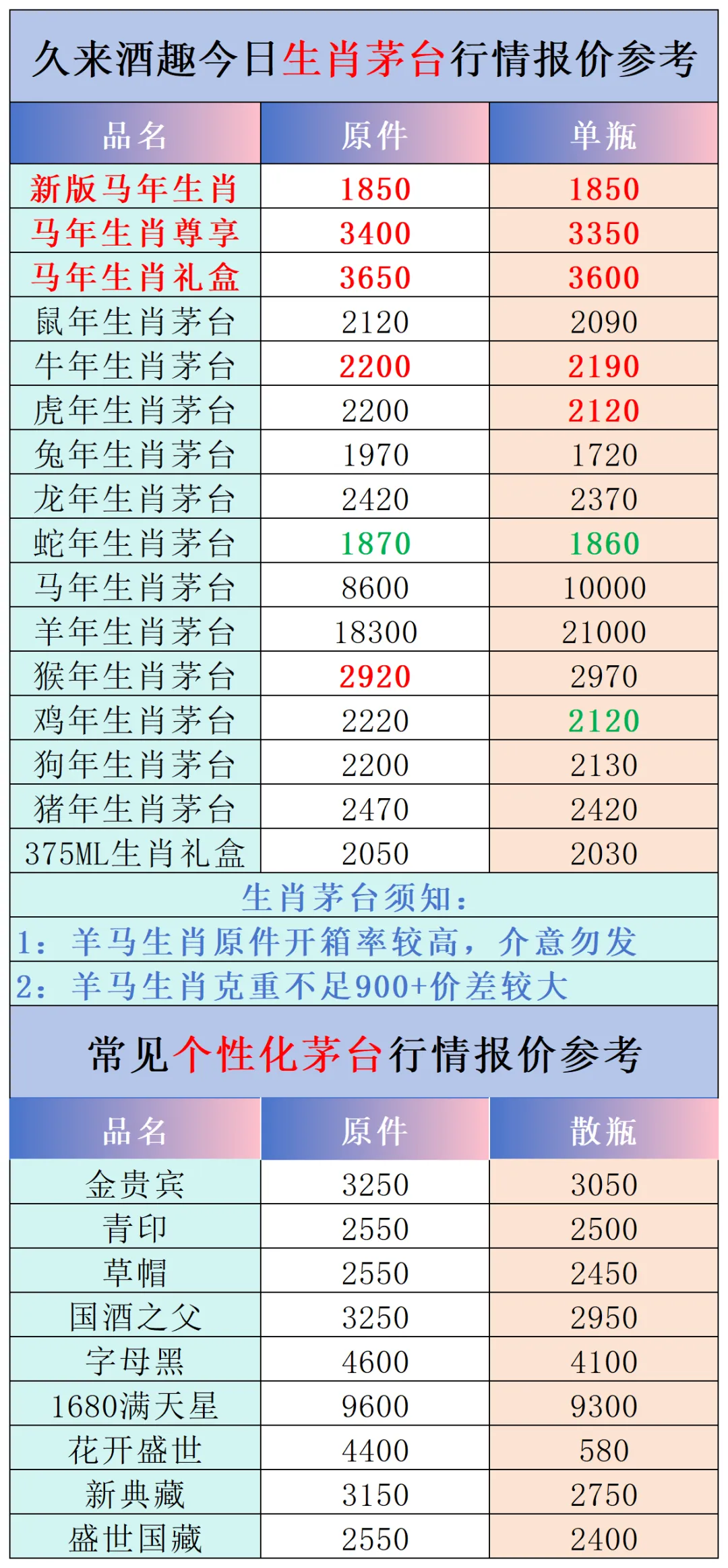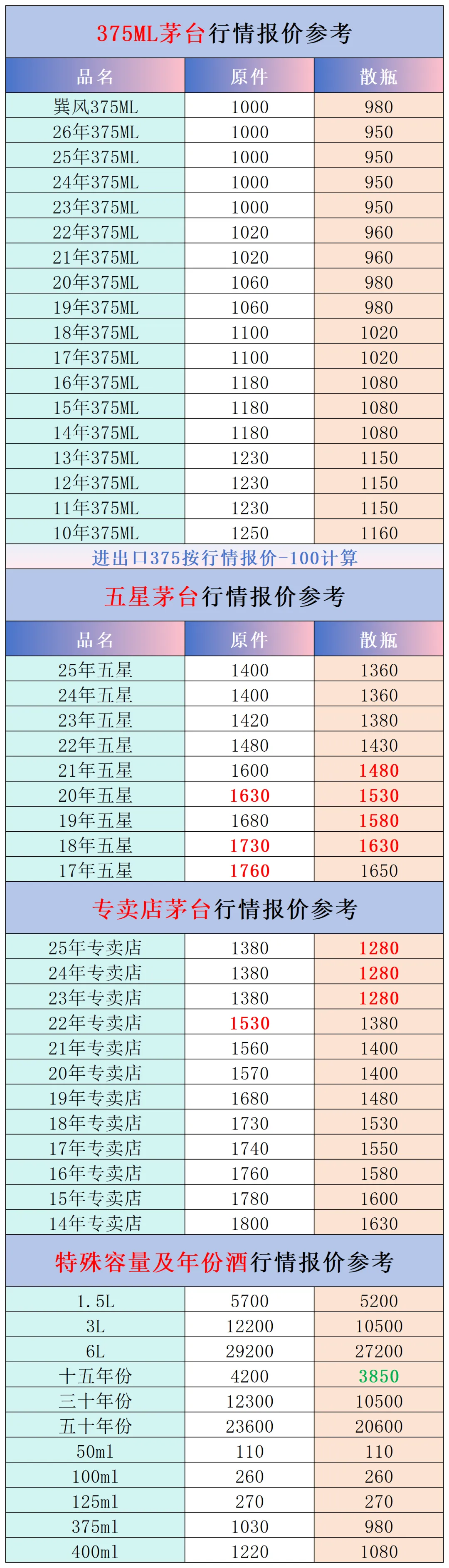 本公众号提供各种名酒回收行情报价,常规茅台、五粮液、洋河、剑南春、国缘等。所有报价根据市场买卖行情总结而来,每天更新最新报价!部分酒水每天涨跌幅较大,无法及时更新请谅解。本报价仅供参考,并非实际成交价格。感谢您的关注!我们会竭尽所能,提供更多更好的服务。