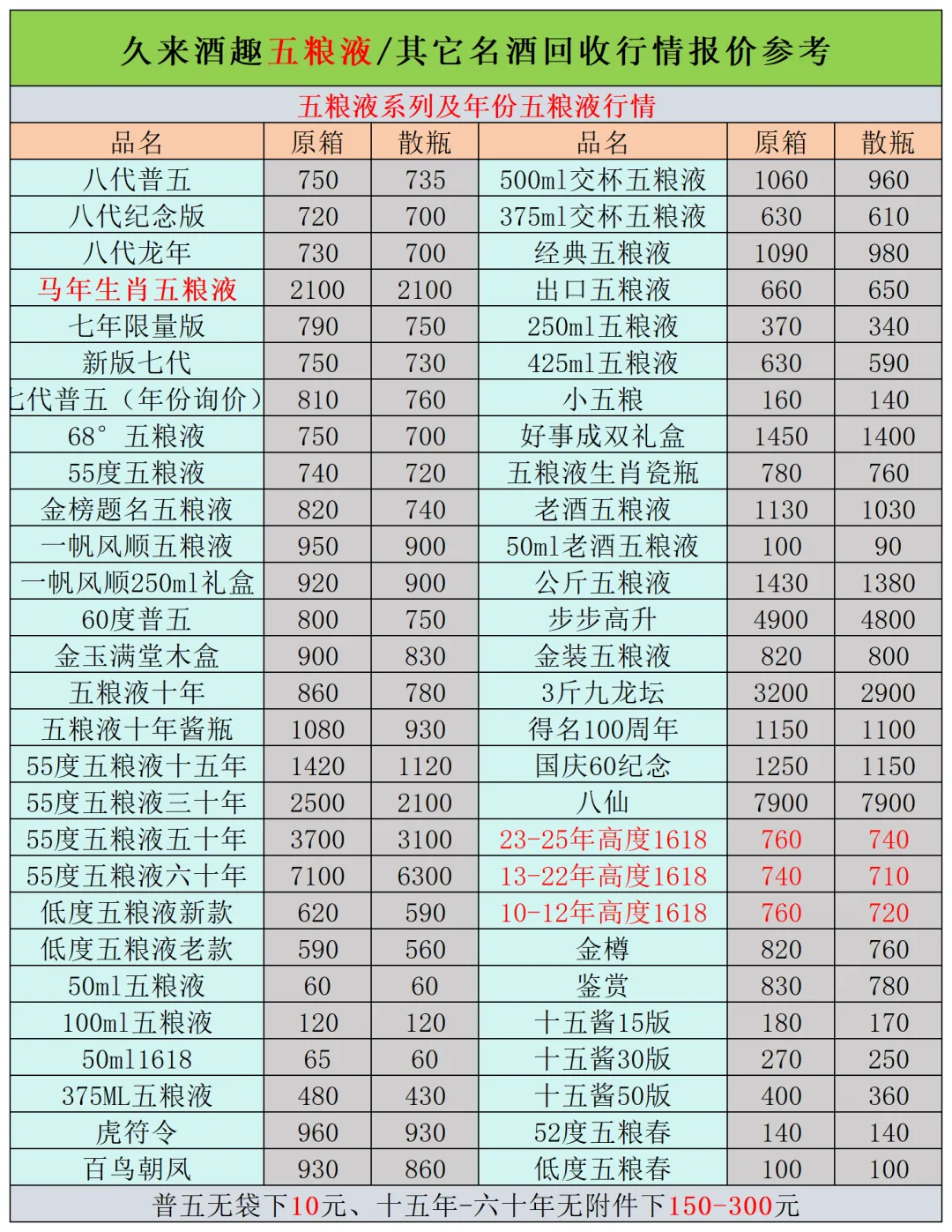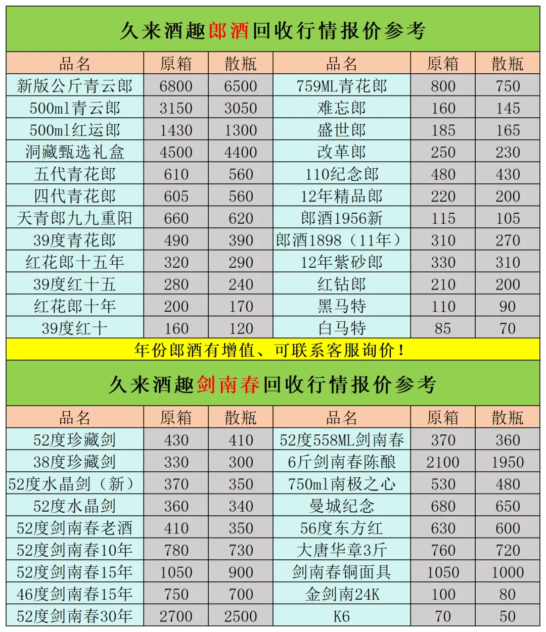本公众号提供各种名酒回收行情报价,常规茅台、五粮液、洋河、剑南春、国缘等。所有报价根据市场买卖行情总结而来,每天更新最新报价!部分酒水每天涨跌幅较大,无法及时更新请谅解。本报价仅供参考,并非实际成交价格。感谢您的关注!我们会竭尽所能,提供更多更好的服务。