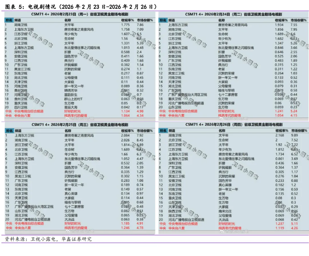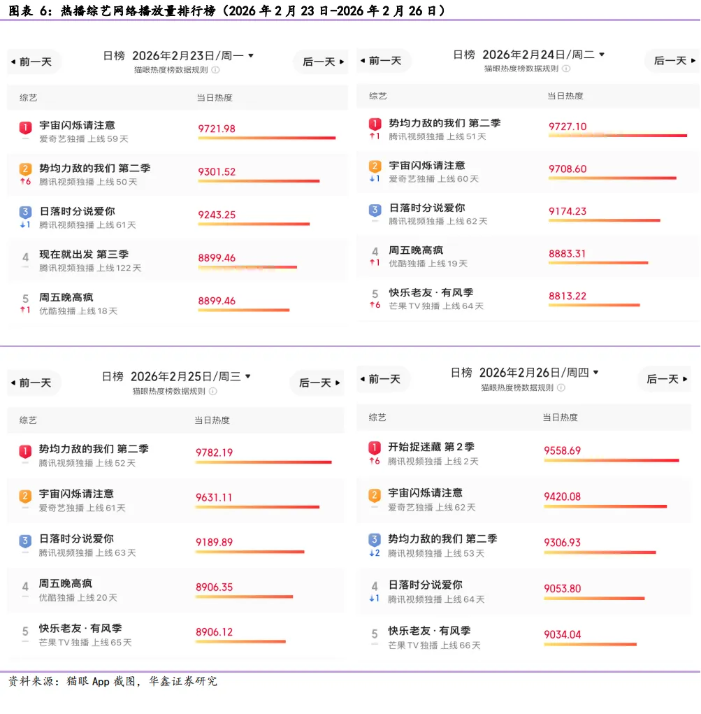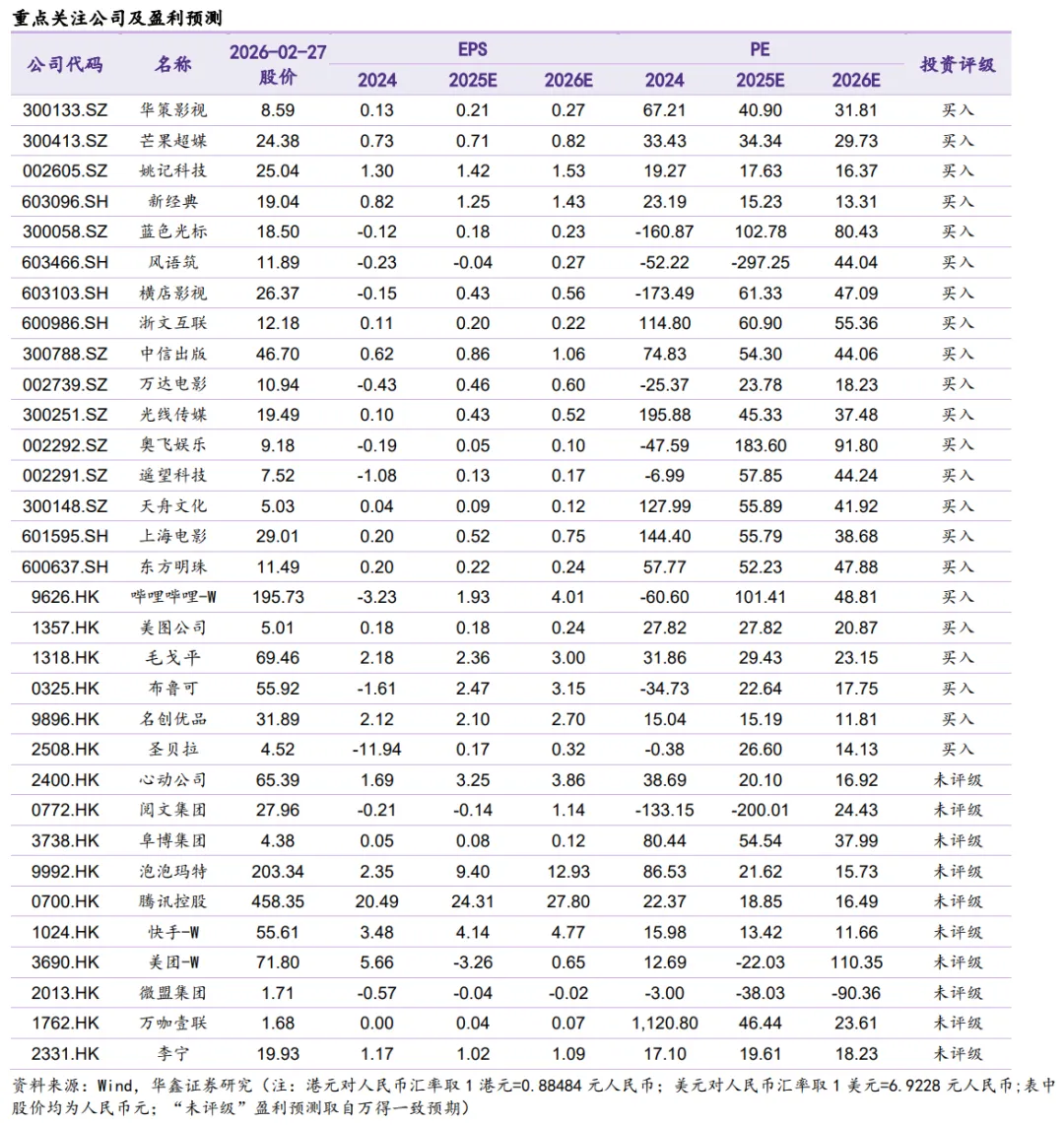 个股跟踪:A股可关注,顺网科技300113(2026年关注游戏新品测试进展,打造“电竞+社交+生活”融合场景,推动电竞文化与商业生态协同发展);姚记科技002605(主业从扑克牌到游戏再到数字营销,受益字节跳动旗下电商抖省省);完美世界002624(游戏新品《异环》全平台公测正式定档2026年4月23日,剧集储备如《何不同舟渡》《芳名三九》《云雀叫天录》《云襄传之将进酒》等);万达电影002739(春节档后回调,在手主投主控影片仍可期);博纳影业001330(2025年主业差强人意业绩承压落地,2026年春节档参与影片《飞驰人生3》表现好,后续可关注《四渡》《克什米尔公主号》《蛮荒禁地》,AI电影《三星堆:未来往事》新供给有望助力主业回暖);横店影视603103(春节档参与影片表现差强人意,静待公司后续业务新进展);芒果超媒300413(融媒体头部践行出海倍增计划,看芒果大模型AI赋能主业,小芒电商迎盈利拐点);奥飞娱乐002292(践行AI+IP战略,2026年新品供给不断,新技术持续发展均有望赋能IP新表达,通过IP运营激活其活力,拓展年轻粉丝圈层,推出的“飓风战魂”陀螺项目打造赛事也在承接新需求);风语筑603466(静待减持落地,受益具身智能应用,作为数字创业行业领军企业,借力AI与IP从新供给端助力“扩内需”战略,从AI应用端打造新交互体验经济应用示范);蓝色光标300058(数字营销头部企业,积极拥抱AI,卡位GEO,并与小红书、智谱建立较好合作外,并与火山引擎达成深度合作);浙文互联600986(地方国企数字营销代表企业,受益于GEO);中信出版300788(央企大众阅读头部企业,主业持续夯实外积极关注AI赋能主业进展);华策影视300133(出品剧集《太平年》热播中并获得社会高关注,全面推进“内容+科技”战略升级,将人工智能技术作为驱动内容创作创新的核心动力,不再盲目追求规模,坚守“收支平衡”的底线,优先修复现金流);恺英网络002517(关注EVE进展,公司国风国漫IP《岁时令》衍生的同名短剧热播);港股可关注,B站9626(社区视频商业价值有望再升,关注三国百将牌游戏产品进展);腾讯0700(看元宝AI后续用户留存进展,核心仍看产品力);阿里巴巴9988(发力千问AI,探索将千问打造软硬一体、跨多种终端形态的AI助手);美图1357(已回购,关注AI赋能旗下产品进展);阜博集团3738(全球领先的数字资产和交易服务提供商);万咖壹联1762(关注AI手机时代AI Agent商业化进展);毛戈平1318(“38”活动接档春节,双渠道联动有望稳定贡献增量);名创优品9896(大力发展IP“YOYO”,公司与春晚联名即采用YOYO形象推出相关衍生品;同事YOYO人形机器人也在开发中)。