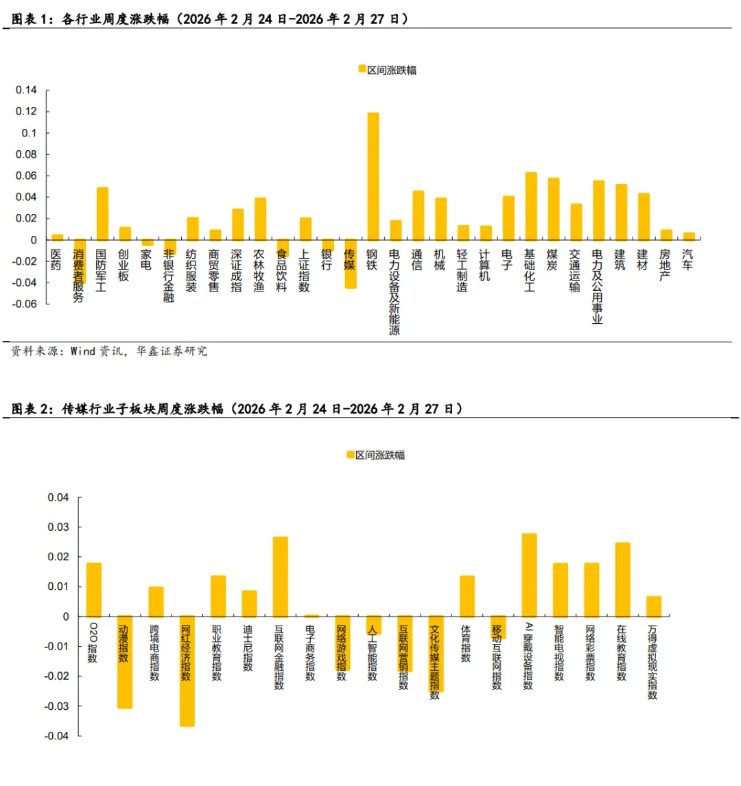 市场综述:2026年2月24日-2026年2月27日,上证综指、深证成指、创业板指的涨跌幅分别为1.98%、2.80%、1.05%。细分到传媒各子行业来看,AI穿戴设备指数涨幅较大,网红经济指数跌幅较大。周涨跌幅个股中,涨幅 Top3 分别为中信出版、金陵体育、佳创视讯,分别上涨37.76%、17.41%、12.69%;跌幅 Top3 分别为博纳影业、光线传媒、横店影视,分别下跌28.97%、28.40%、24.44%。