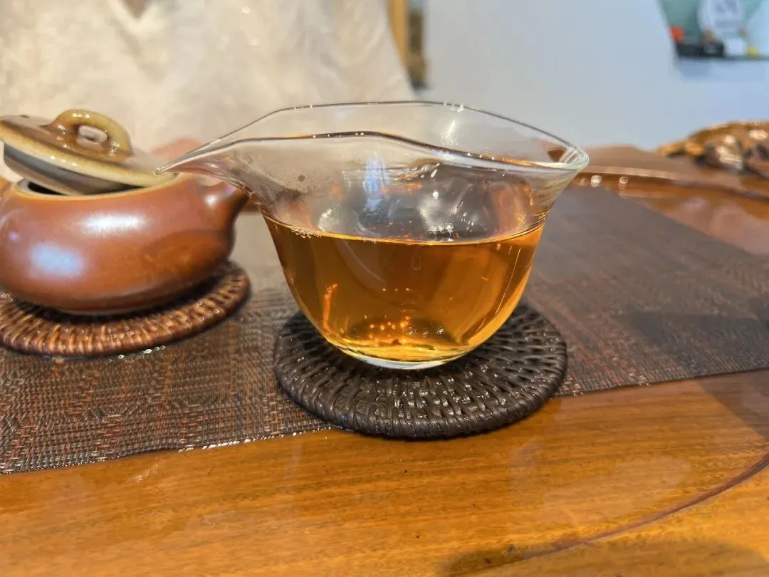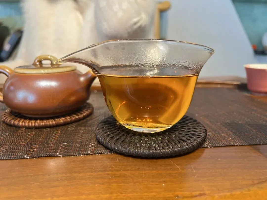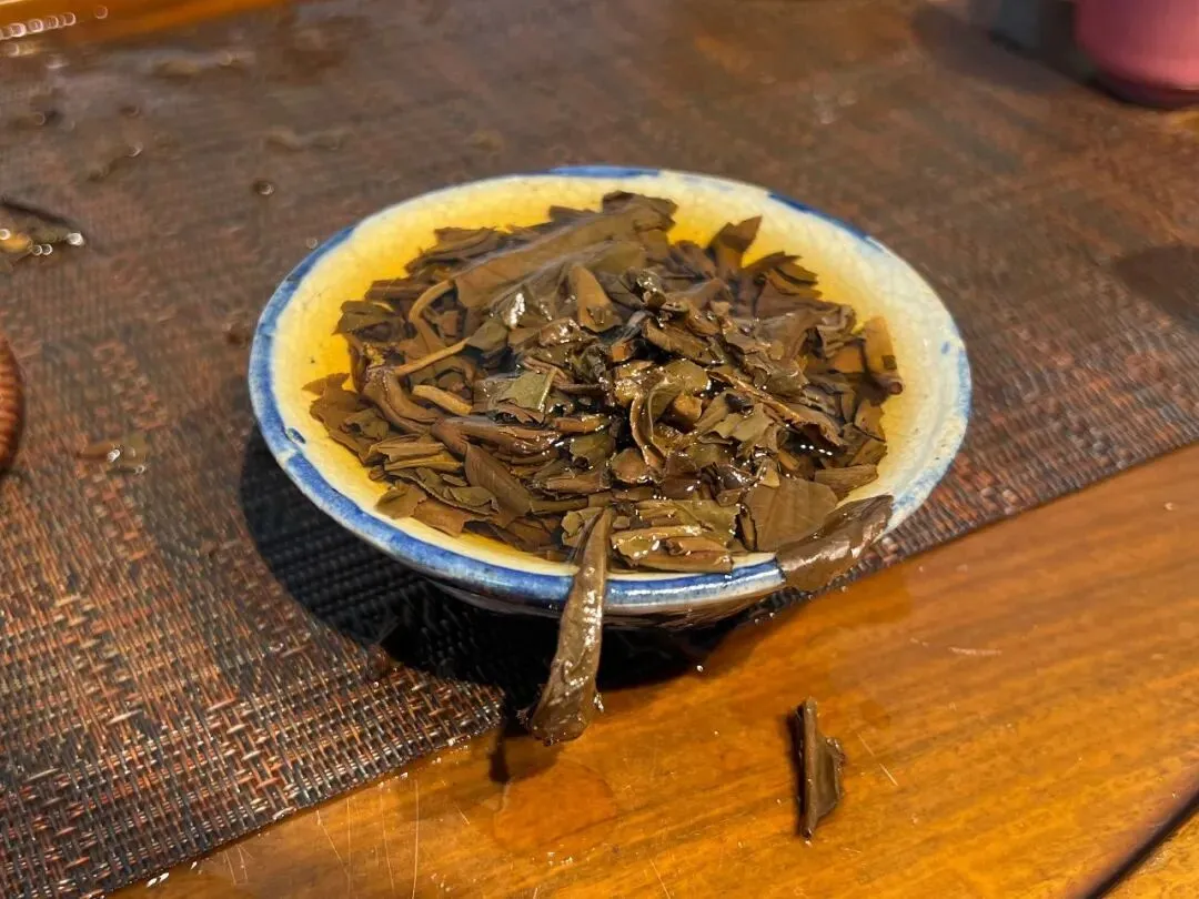 头道茶汤:入口先是甜润,紧接着苦韵就上来了,但不烈,化得也快。原叶香、药香、陈香在嘴里散开,滋味厚实饱满,有力量感。生津回甘几乎是同时来的,快且持久。喝完喉咙深处有清凉感往上返,很舒服。