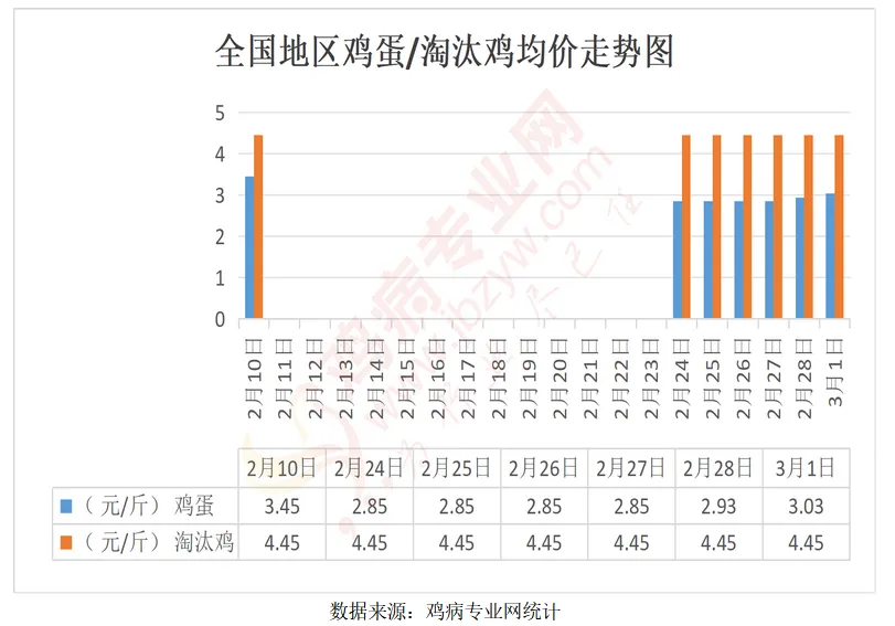 根据卓创数据,从2月10日到2月27日,淘汰鸡价格从4.47元/斤上涨到4.92元/斤,涨幅较大。总体来说,春节假期过后至今,鸡蛋和淘汰鸡价格都在上涨。