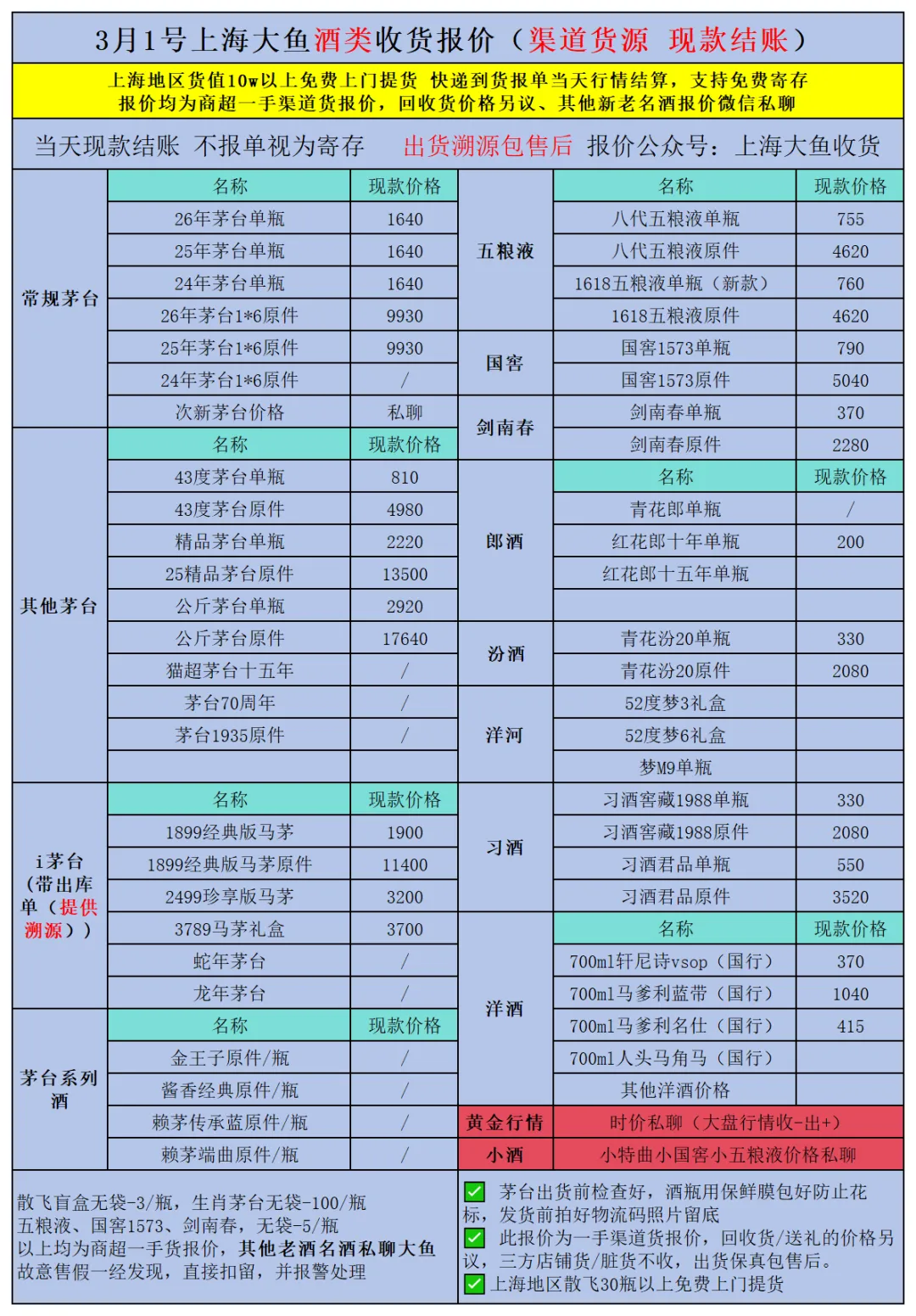 此报价为一手渠道货报价,回收货/送礼货价格另议,烟酒店回流货/三方店铺货/脏货不收,出货默认保真、永久溯源、包售后、故意售假扣货报警、不接任何国补货源