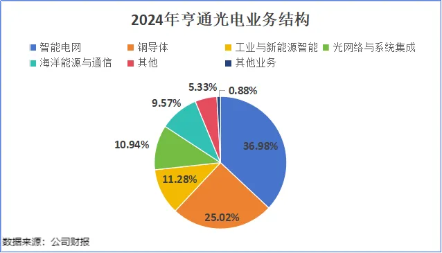 亨通光电的业务比较广泛,主要围绕通信和能源两大核心,形成了光通信、智能电网、海洋能源与通信、工业智能、铜导体五大业务支柱。