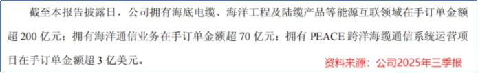 其中海底电缆、海洋工程及陆缆产品等能源互联领域在手订单金额超200亿元;海洋通信业务在手订单金额超70亿元;PEACE跨洋海缆通信系统运营项目在手订单金额超3亿美元。