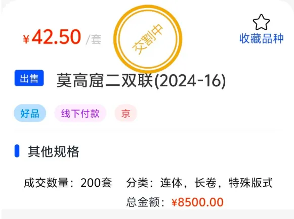 昨天,《莫高窟(二)》双连张以42.5元的单价成交200版,创出其发行上市以来的新高。