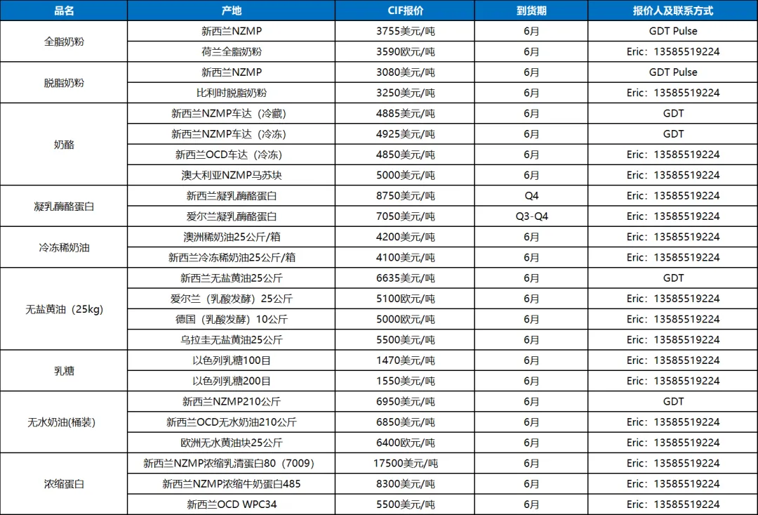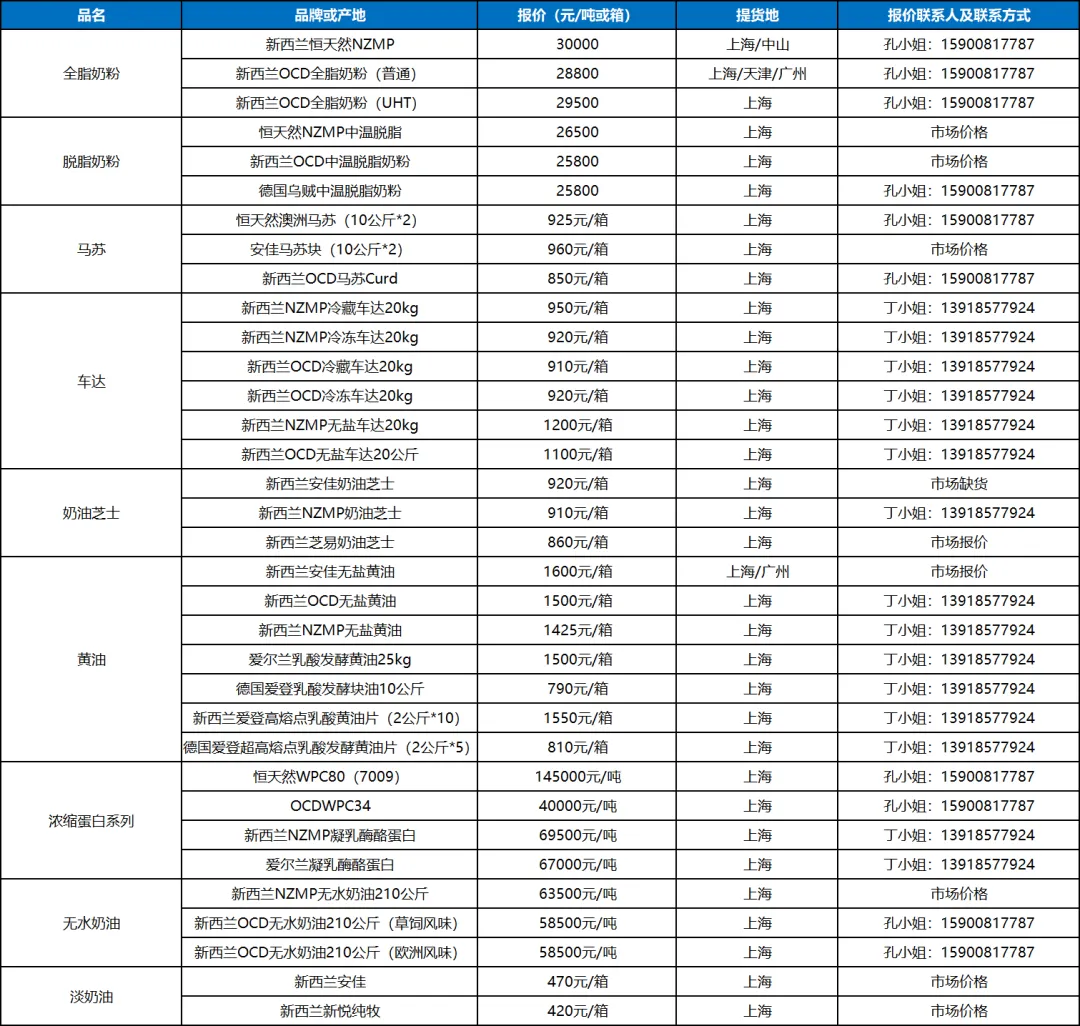 奶油芝士:奶油芝士随产区不同,境况迥异,新西兰品牌畅销,而澳洲某品牌由于包装问题大幅度抛货拉低了市场价格;国产奶油芝士供应平稳,近期很难成为市场主流。
