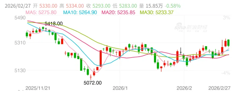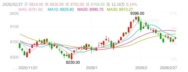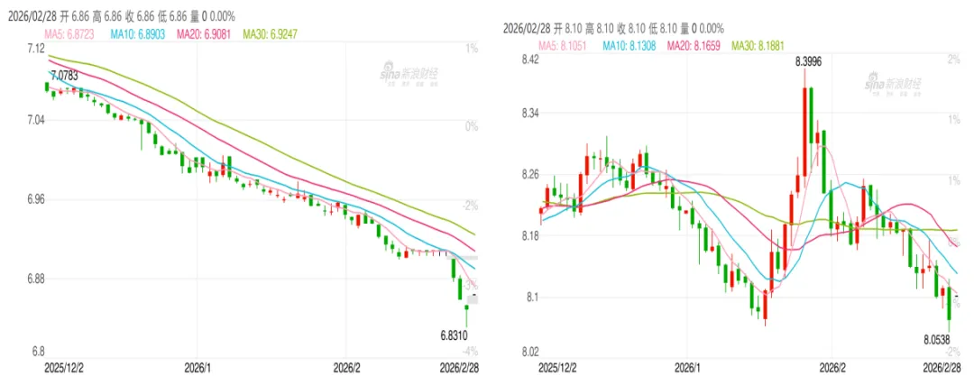 2. 美/欧/日/韩经济数据:(1)美国1月生产者价格指数(PPI)同比上涨2.9%,预期2.6%;1月PPI环比上涨0.5%,预期0.3%。美国1月核心PPI同比上涨3.6%,预期3%;1月核心PPI环比上涨0.8%,预期0.3%;(2)美国劳工部于2026年2月26日公布的数据显示,截至2月21日当周,经季节性调整后的初请失业金人数为21.2万人。这一数值低于市场预期的21.5万人,但较前一周经修正后的20.8万人有所增加。前值最初报告为20.6万人,后被修正为20.8万人。