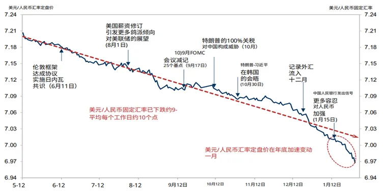 1、短期来看,11月底以来人民币汇率加速升值主要受到两个因素的推动:其一,市场进入“弱美元”交易,11月末至今美元指数从100.22下跌至97.51,跌幅近2.7%,非美货币普遍呈现升值;其二,从内部来看,年末人民币结汇需求通常季节性走强,叠加较强的升值预期,2025年年末的结汇需求显著强于季节性,12月银行代客结售汇顺差达999亿美元创历史新高,外汇供求关系有利于人民币走强;