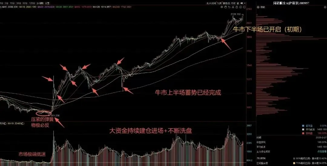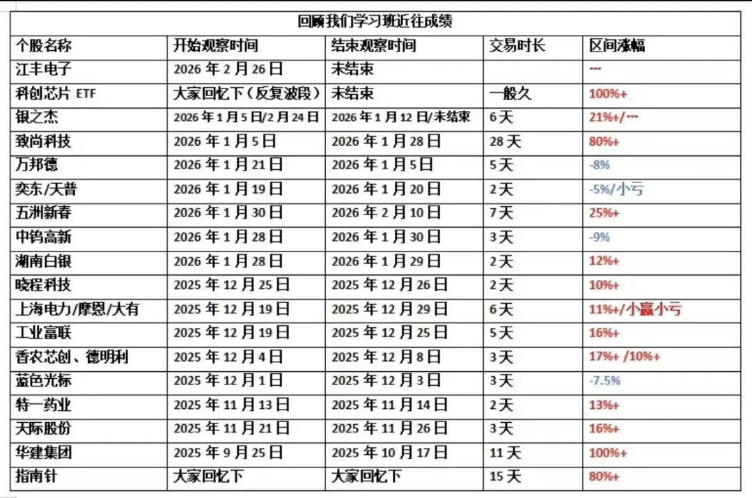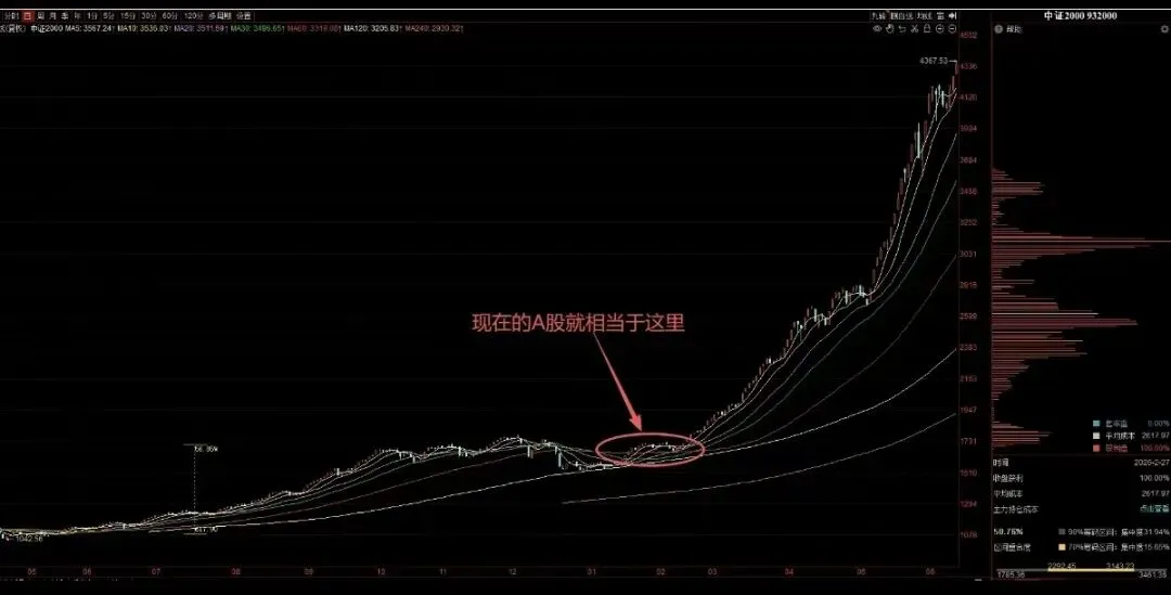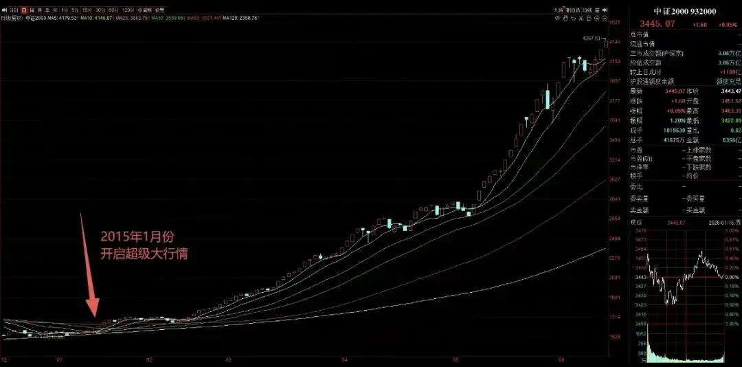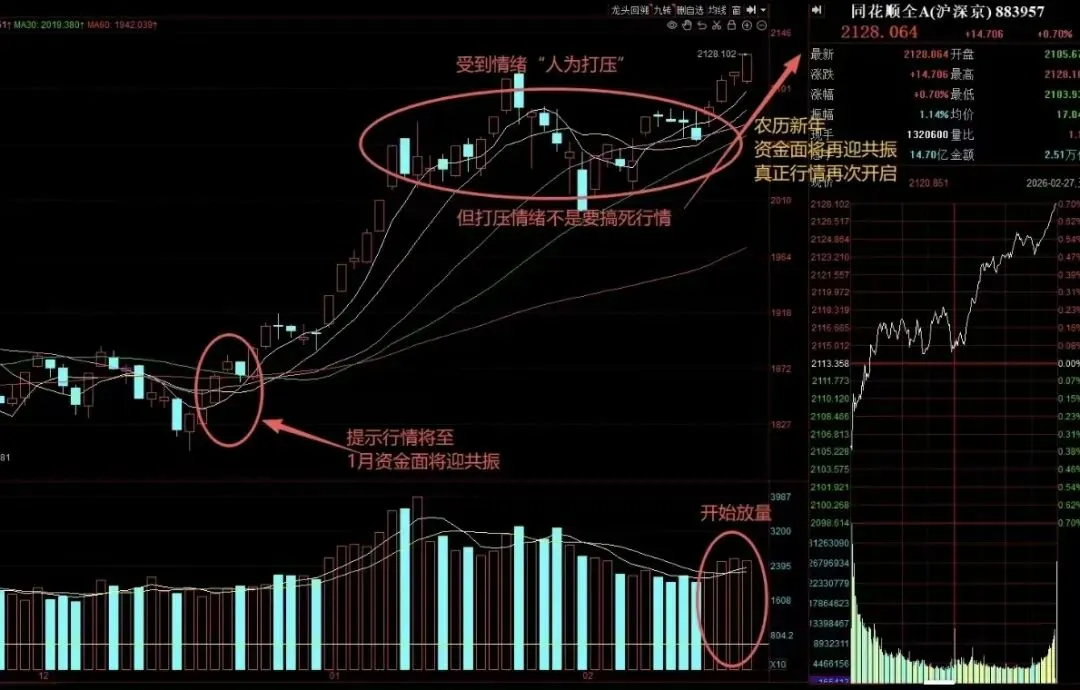 又是几年过去了,简单回顾一下过往,今天跟大家说点比复盘更重要的事情。现在回头想想,这轮牛市以来我们说过的所有核心观点,是不是基本都判断对了~市场大底时“市场像压紧的弹簧”,黎明前的黑暗,降息周期的开启,精准潜伏(萝卜、等票……),9.24行情的开启,10.8日新人进场老人退守避开暴跌,2024.12.13日波段见顶风险,2025.1.13地量见地价机会,2025.3.21日波段见顶风险,2025.4.7物极必反机会开启行情,等等……再复杂的市场变化,我们都顺利的一路穿越了过来,每一次关节阶段,对投资成败与大方向判断起到决定性作用。近期,记得在12月份低位的时候,我们多次提示大家“1月份是行情开启的时候,会迎来资金面共振”。果然,后面成交额一度达到3.99万亿的峰值,但村里眼看越来越疯了,只好紧急给市场降温,但降温不是要把市场搞死,主力也趁着这次降温完成了一次快速洗盘,接下来只要不出现9.24那样超疯牛,不会再管了。而现在正是农历新年,元宵后或将再次迎来资金面全面共振之时,也或会是新一轮行情正式开启之时。当前全A指数已经轻松的再次创出了新高,有的资金已经在率先进场了。再看看亚太市场外部的其它股市现在是怎么涨的!都已经是在持续大慢牛了。现在也该轮到A股表现,A股3亿股民/340多万亿的后备资金实力,一旦形成牛市赚钱效应的“飞轮效应”不是开玩笑的。大家可以回顾一下2007年、2015年、2020年的白酒新能源。(下图2014年~2015年中证2000指数)而且上半年也是最容易走超级大行情的,1996、2006、2009、2013创业板、2019、历史上的超级大行情几乎都是发生在上半年。(资金面共振布局引动)抓住市场的结构性方向与节奏,才能成为2026年最大赢家。过去的市场非常曲折复杂,但我们学习班内的家人整体依旧都取得了非常不错的成绩。(以下班内消息记录依然在,都有目共睹,新进班的也可以去回顾,我们偶尔也会错,但整体是赢大亏小的,严格止损的。)现在市场资金再次进场,相信接下来牛市下半场,市场的大机会只会越来越多。本文所涉历史案例(包括个股、图表、业绩区间)均基于特定市场条件,具有偶然性和片面性,不代表未来走势,仅作教学参考,不构成投资建议。班内都是盘中的实时分享,且都是有始有终并非常详细的提示。