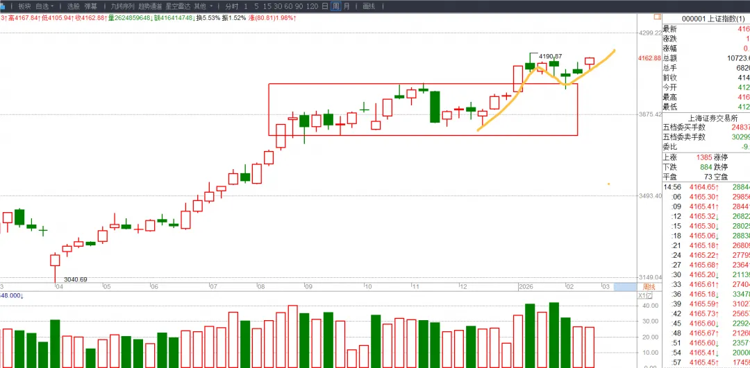 大盘的周线越走越好了,这是箱体突破以后的回踩箱顶确认再弹起走新波段。只要突破前高点,本次的上涨波段就会确立。我个人觉得突破也是大概率的事情,因为前面的箱体震荡可以认为是前期上涨的一个休整区,简单的说就是洗盘区,现在盘子洗干净了那就可以继续上涨了。